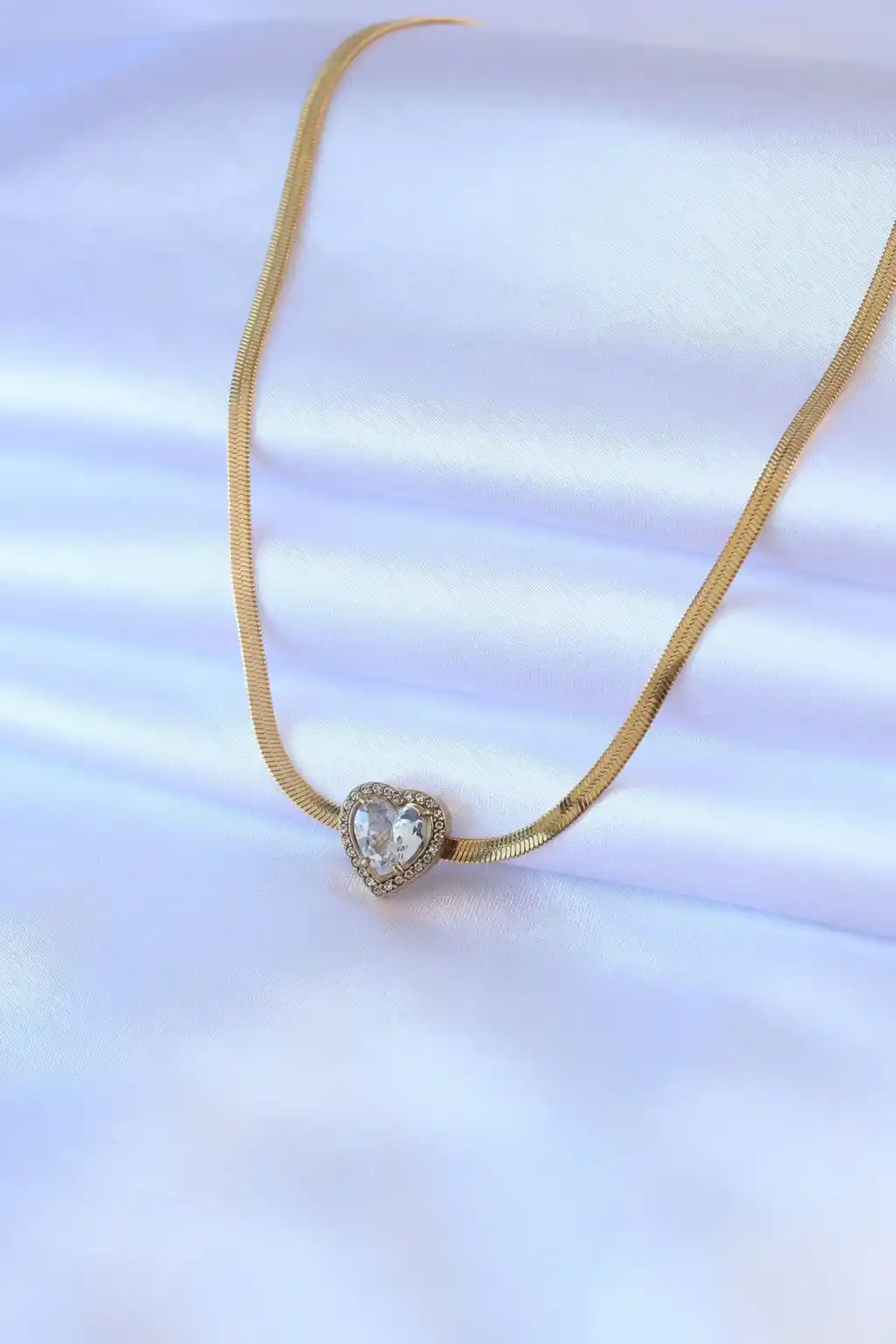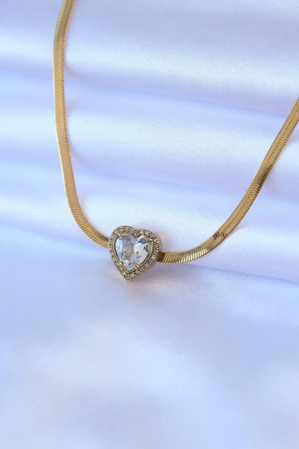316L Çelik Gold Renk İtalyan Zincir Model Zirkon Taşlı Kalp Figür Kadın Kolye