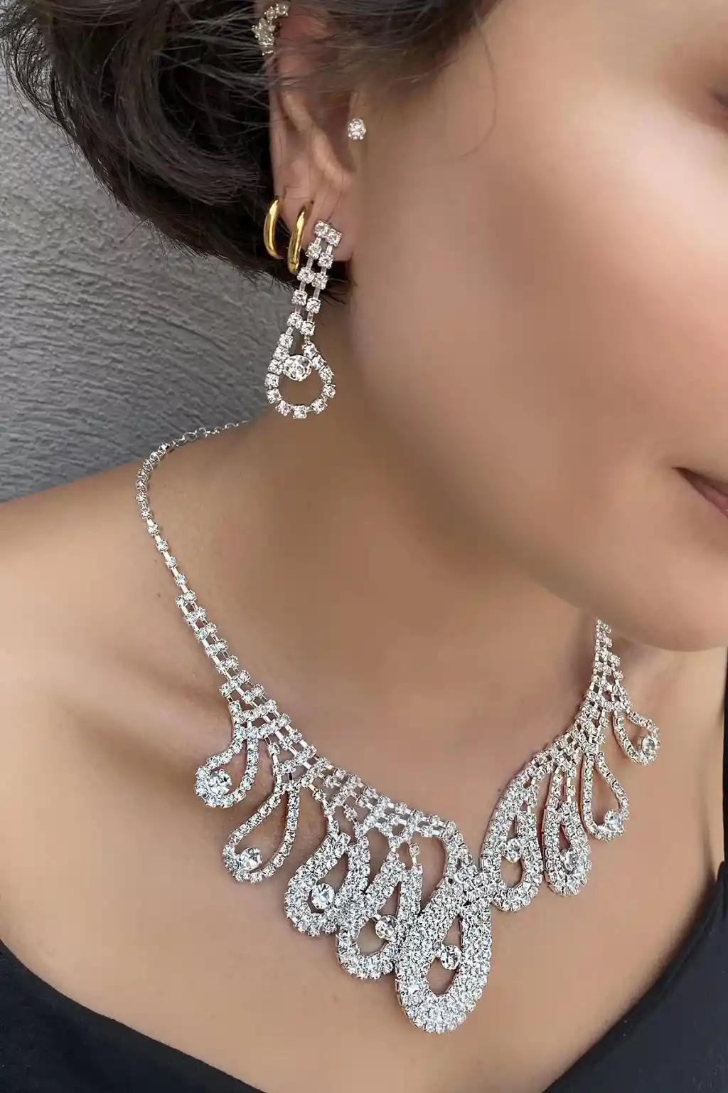 Şıklığınızı tamamlayan detaylarla tasarlanmış Abiye Kolye Küpe Set, her kadının koleksiyonunda bulunması gereken özel bir aksesuardır.; Yüksek kaliteli malzemelerden üretilmiştir, uzun süreli kullanım sağlar.; ; Mükemmel işçilik ile parıl parıl parlayan taş detaylı tasarıma sahiptir.; ; Boyunda ve kulakta hafif bir kullanım sunarak rahatlık sağlar.; ; Zarif ve şık tasarımı ile hem günlük hem de özel günlerde kullanılabilir.; ; Kolye ve küpede uyumlu bir görünüm sunan set, kombininizi tamamlar.; ; Pratik klips mekanizması sayesinde kolayca takılıp çıkarılabilir.; ; Geleneksel ve modern tarzları bir araya getiren tasarımı ile her tarza hitap edecek bir parça.; ; Özel günlerinizde veya sevdiklerinize hediye edebileceğiniz bu set, zarif bir sunum kutusu ile birlikte gelir.; Her anınızda ışıltınızı arttırmak için ideal seçimdir.