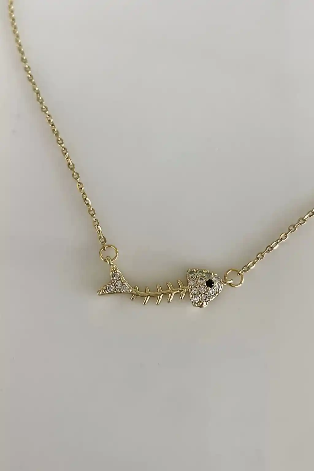 Altın rengi balık figürlü çelik kolye, şık ve zarif bir görünüm sunar.