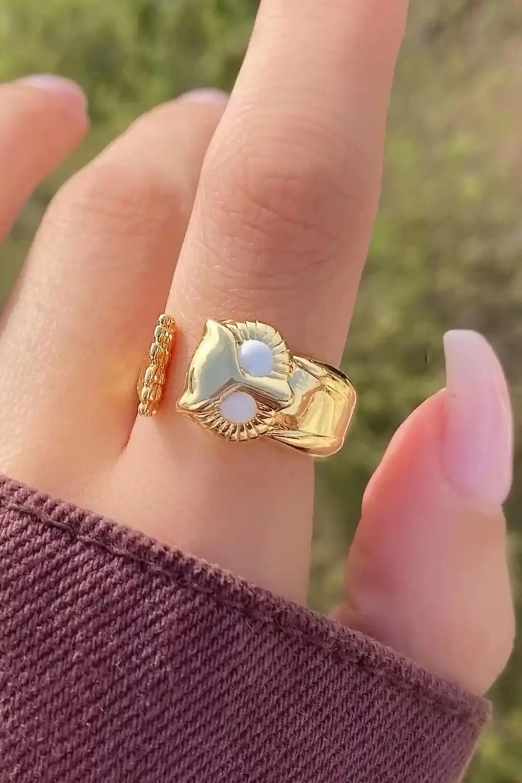 Altın Renk İnci Detaylı Nazar Boncuk Figürlü Ayarlanabilir Yüzük