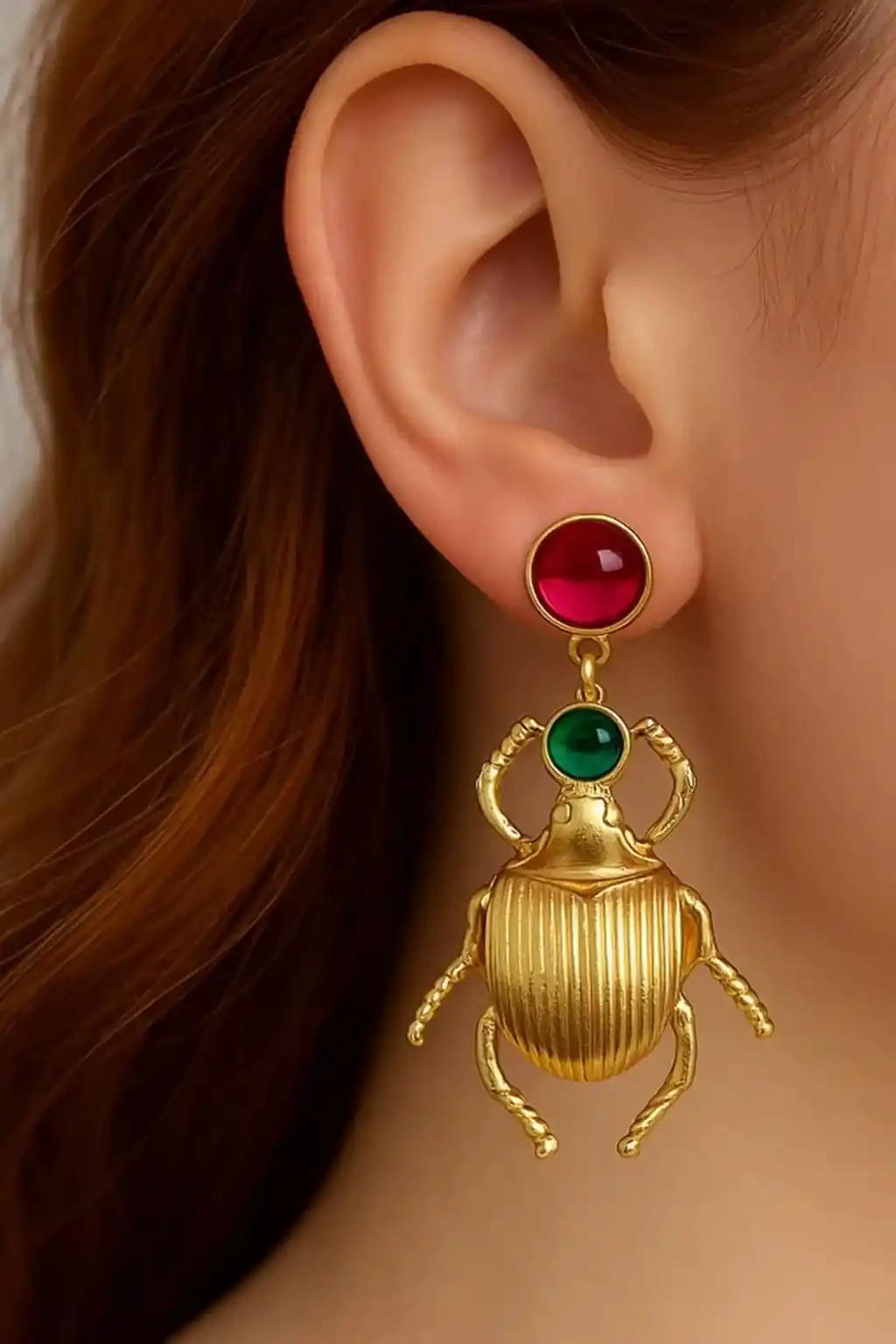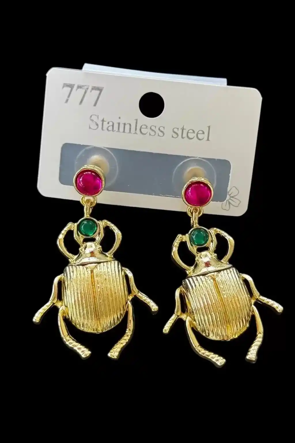 - Altın rengi böcek figürleriyle süslenmiş, şıklığınızı tamamlayacak çelik küpeler.; - Her iki tarafta da bulunan sallantılı tasarımlarla göz alıcı bir stil sunar.; - Dayanıklı çelik materyali sayesinde uzun süreli kullanım imkanı sağlar.; - Hem kadın hem de kız kullanıcılar için uygun tasarım, her yaş grubuna hitap eder.; - Yerli üretim olarak Türkiye'de üretilmiş olup, kalite standartlarına uygun şekilde tasarlanmıştır.