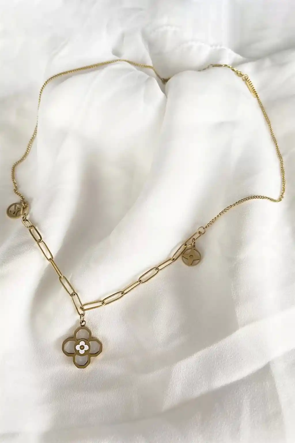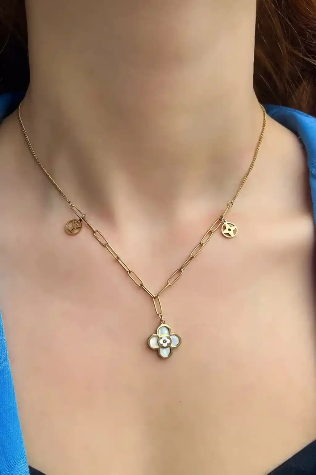 Altın renk çiçek figürlü çelik kolye, şıklığı ve zarafeti bir arada sunar. Bu özel tasarım kolye, kadınların günlük hayatta ve özel günlerde tercih edebileceği şık bir aksesuardır.
