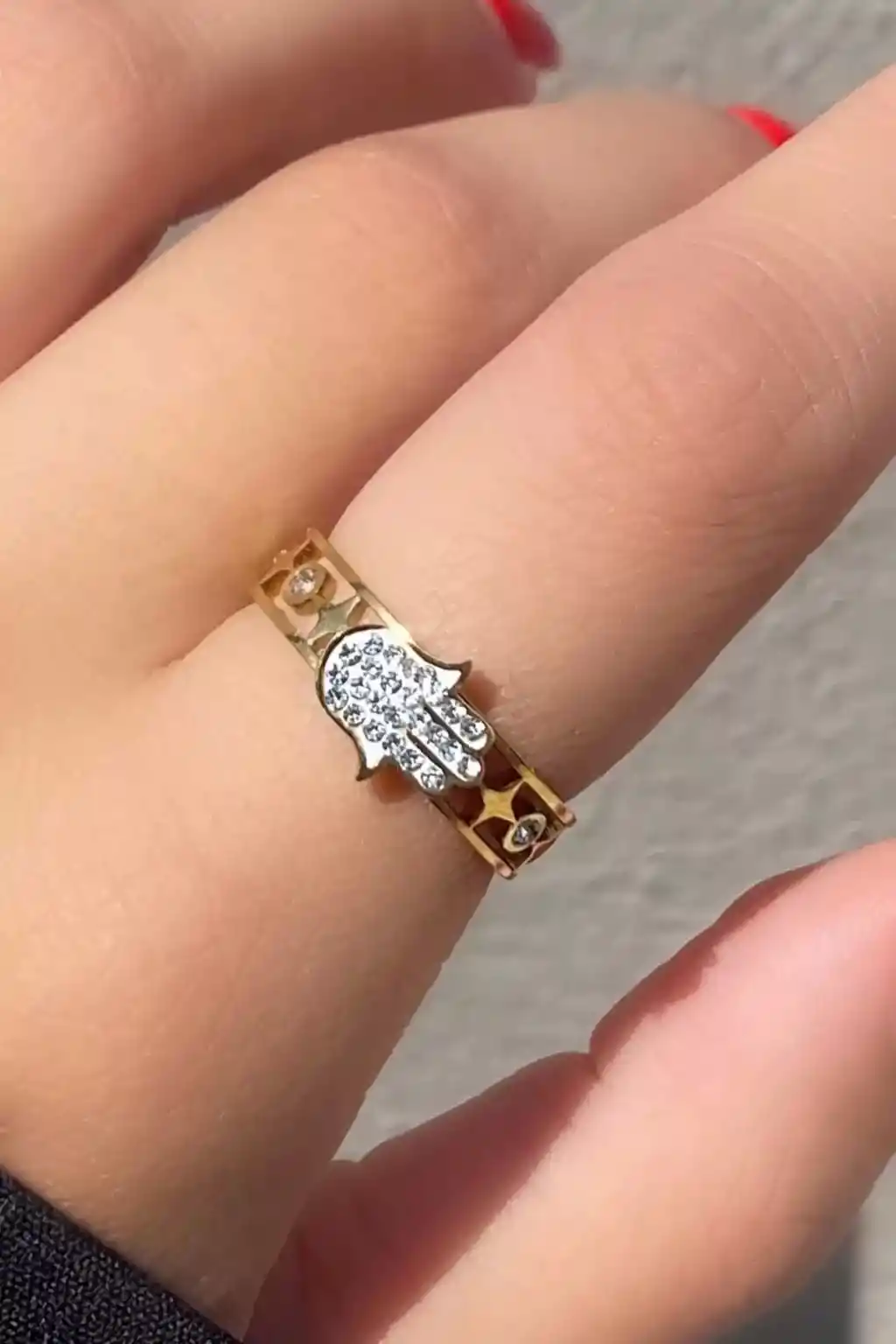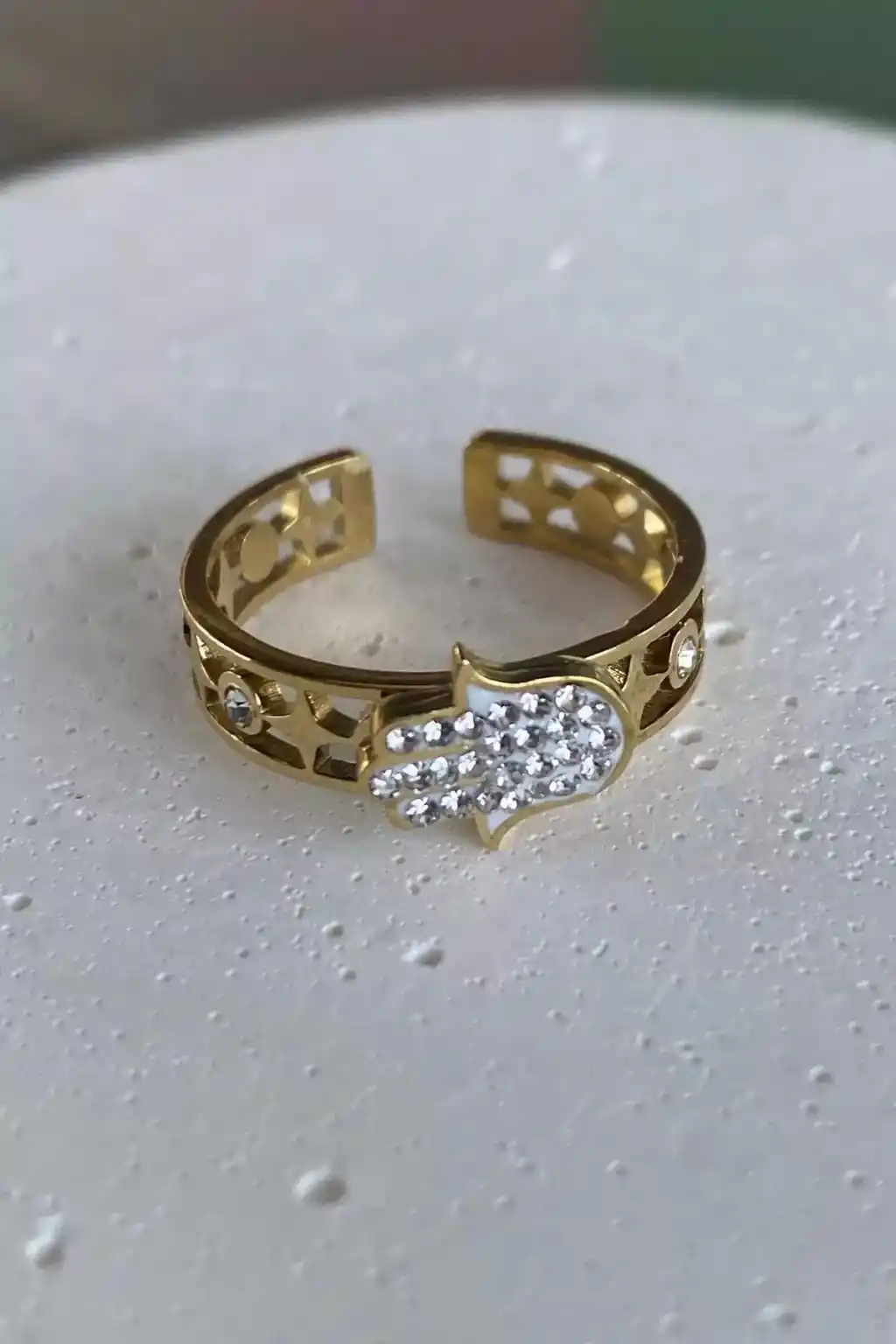 Altın Renk El Figürlü Taş Detaylı Ayarlanabilir Çelik Yüzük, zarif tasarımı ve pratik kullanımı ile koleksiyonunuzun vazgeçilmez bir parçası olacaktır.