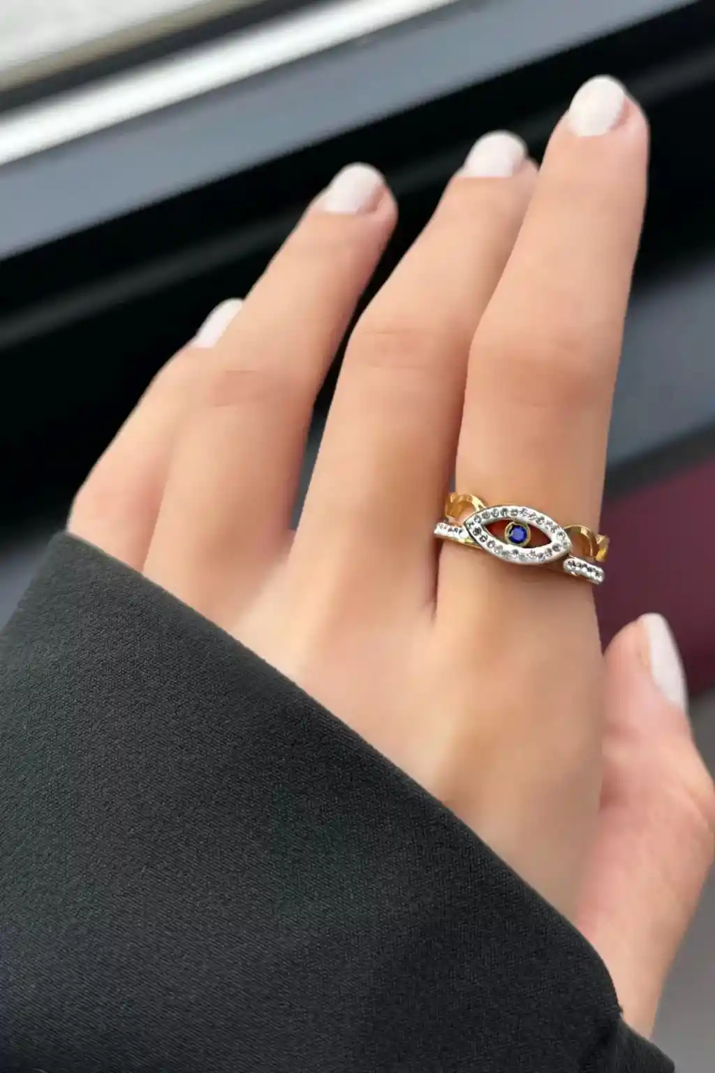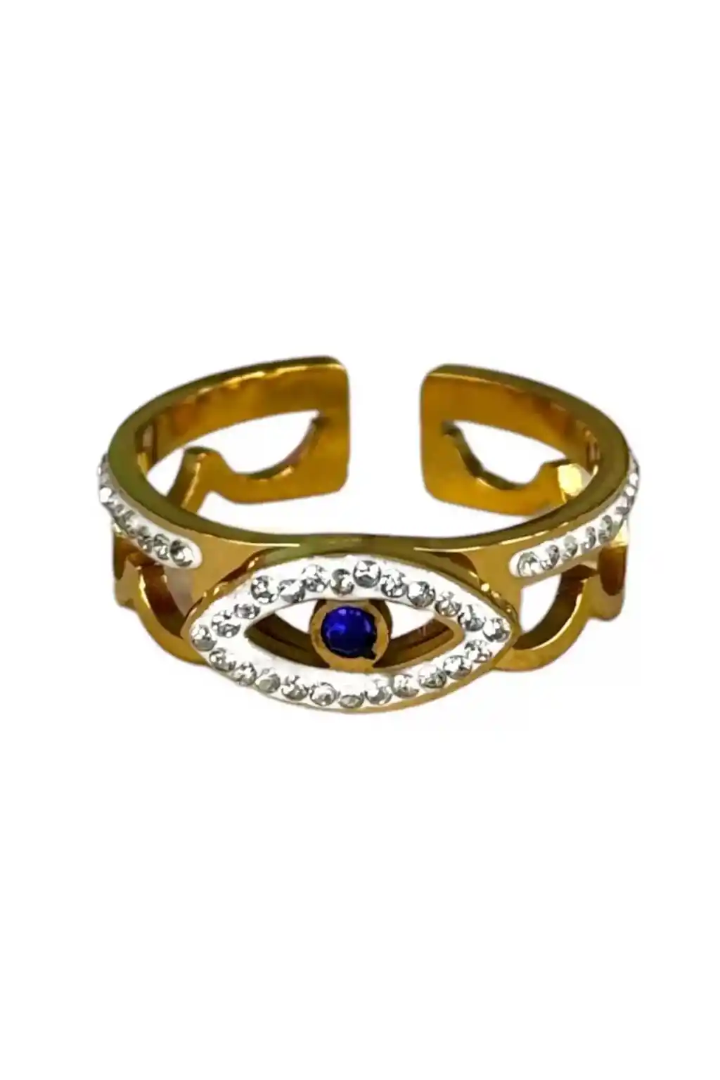 Altın Renk Göz Figürlü Çelik Ayarlanabilir Yüzük, şıklığı ve zarifliği bir arada sunan bir takı ürünüdür. Her yaş grubundan kullanıcıya hitap eden bu yüzük, farklı stillere kolayca uyum sağlar.