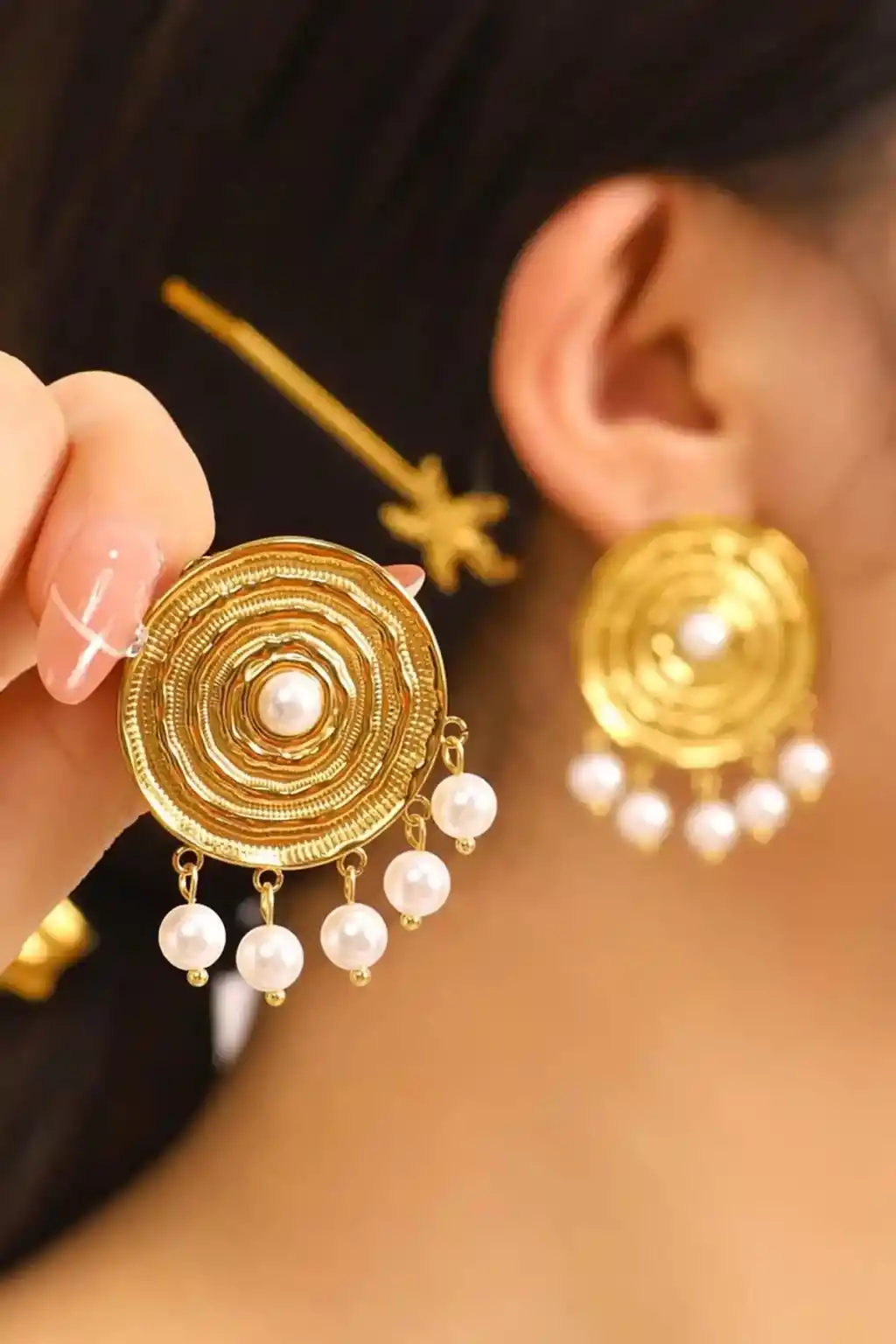 - Zarif tasarımıyla dikkat çeken altın renkli inci detaylı çelik küpe, günlük kullanım için idealdir.; - Kadın ve kızların beğenisine sunulan bu küpeler, şıklığınızı tamamlayacak zarif bir aksesuardır.; - Dayanıklı çelik materyali sayesinde uzun süreli kullanım vaat ederken, inci detaylarıyla göz alıcı bir parlaklık sunar.; - Günlük kombinlerinizde kolayca uyum sağlayacak olan bu küpeler, her türden kıyafetle mükemmel bir uyum yakalar.