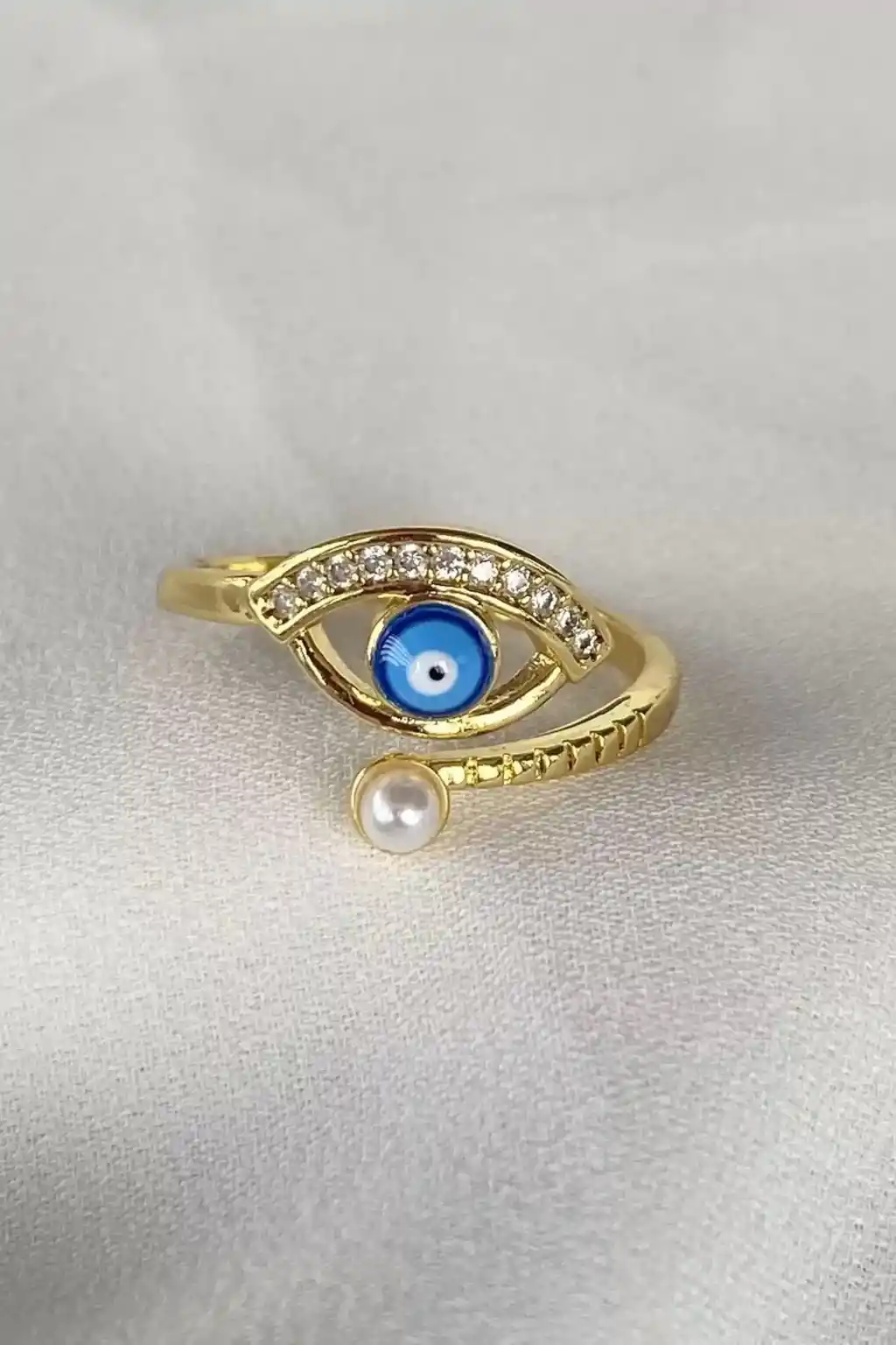 Altın Renk İnci Detaylı Nazar Boncuk Figürlü Ayarlanabilir Yüzük