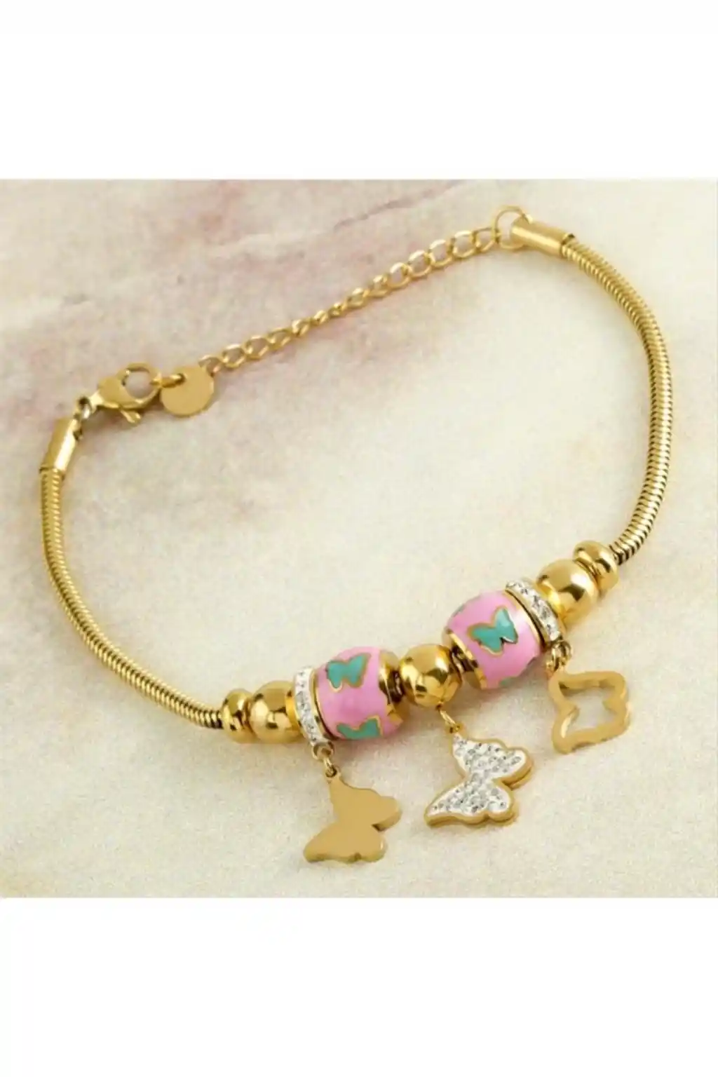 - Zarif altın rengi kelebek figürleriyle süslenmiş, şıklığı ve zarafeti bileğinizde taşıyın.; - Dayanıklı çelik materyali sayesinde uzun süreli kullanım sunar ve günlük aktivitelerinizde rahatlıkla tercih edebilirsiniz.; - Kadın ve kız kullanıcılar için ideal olan bu bileklik, özel günlerde veya günlük kombinlerinizde fark yaratmanızı sağlar.; - Taş detayının bulunmaması, minimalist tasarım severler için mükemmel bir seçim haline getirirken, her türlü kıyafetle uyum sağlar.