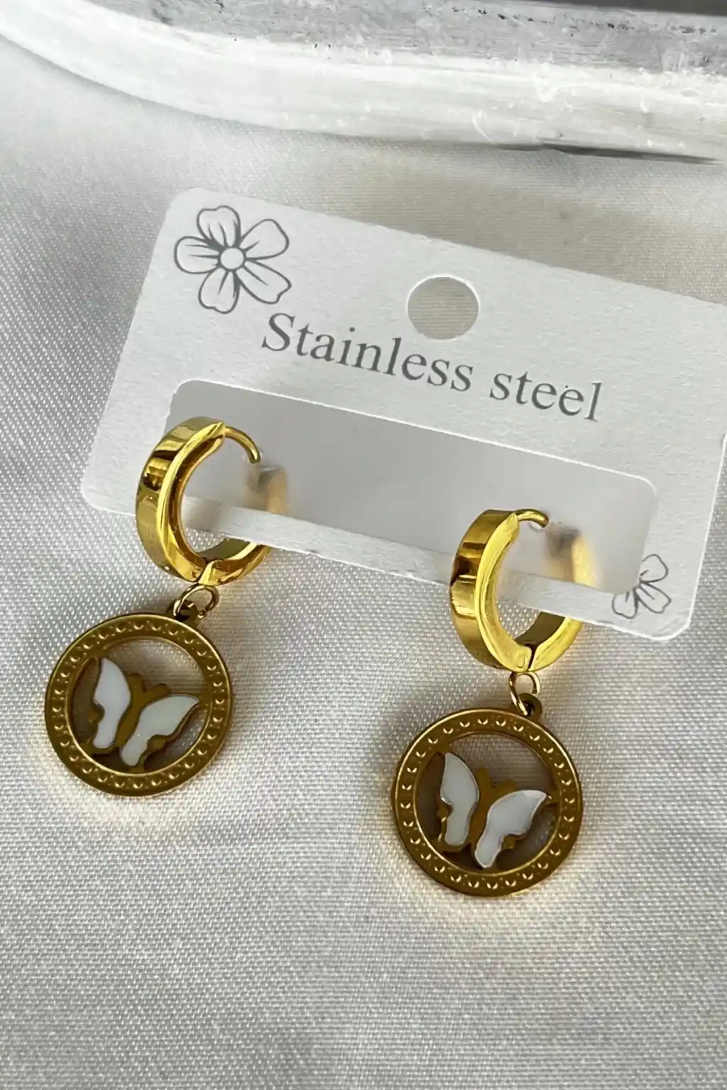 Altın Renk Kelebek Figürlü Çelik Küpe, zarif tasarımı ve kaliteli malzemesi ile şıklığınızı tamamlamak için ideal bir aksesuardır. Kadın aksesuar kategorisinde yer alan bu küpe, stiline önem veren kadınlar için özenle tasarlanmıştır.