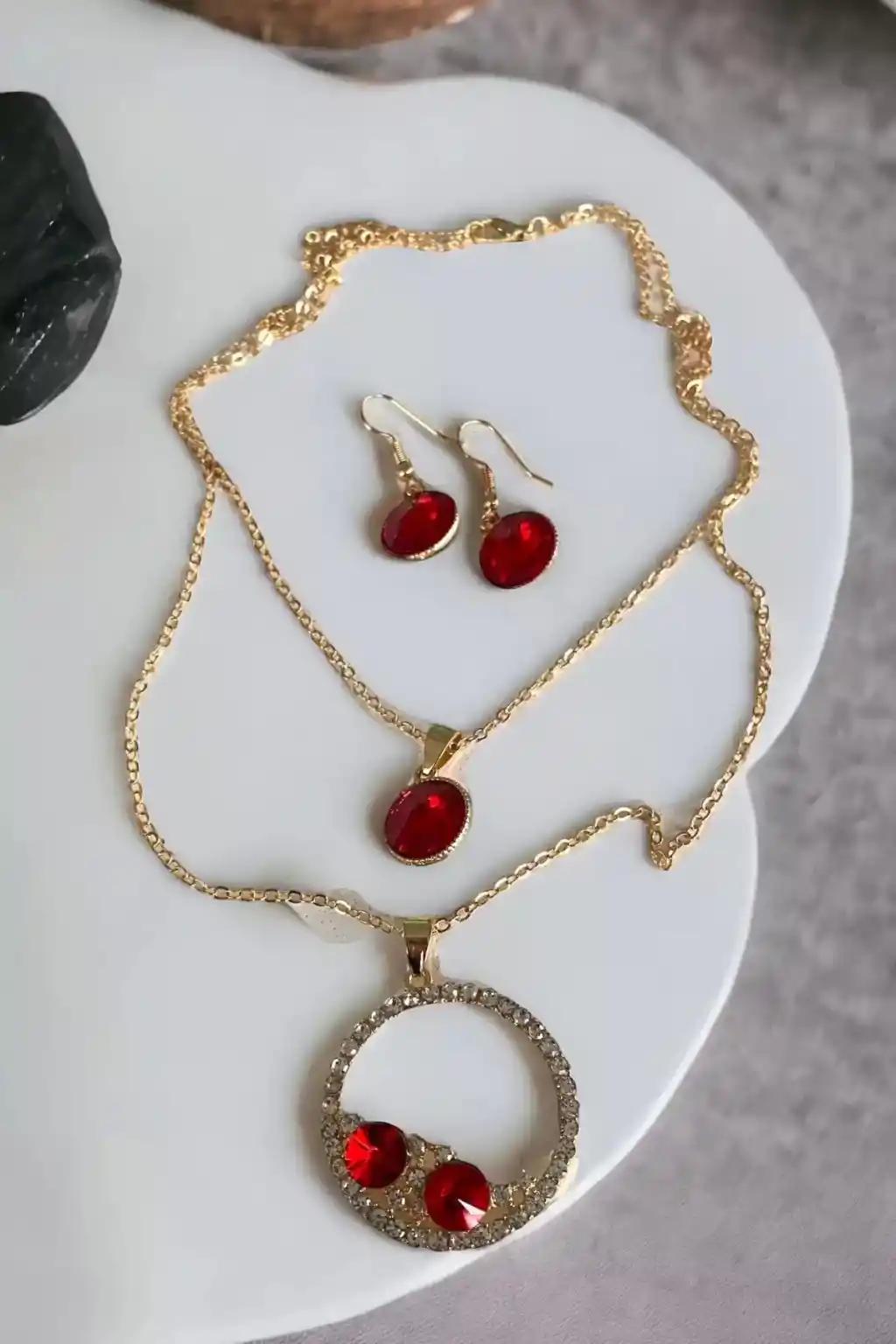 İnce zevklerin buluşma noktası olan Altın Renk Kırmızı Taş Detaylı Kolye Küpe Abiye Set, stilinizi tamamlamak için ideal bir seçimdir.; Bu zarif set, özel günlerinizde göz alıcı bir şıklık sunar ve her daim dikkatleri üzerinize çekmenizi sağlar.; Şık ve Zarif Tasarım: Altın renkli çerçeveyle çevrelenmiş kırmızı taş detayları, sofistike bir görünüm sunar.; ; Yüksek Kalite Malzeme: Dayanıklı ve kaliteli malzemelerden üretilmiştir, uzun süreli kullanım sağlar.; ; Özel Günler İçin Uygun: Abiye elbise ve özel etkinlik kıyafetleriyle kusursuz bir uyum yakalar.; ; Hafif ve Rahat: Kolye ve küpenin hafif yapısı sayesinde konforlu bir kullanım sağlar.; ; Kolay Kullanım: Pratik kapanışı sayesinde kolayca takılıp çıkarılabilir.; ; Bu etkileyici kolye küpe set, tarzınıza ayrı bir hava katarken; zarafeti, şıklığı ve kaliteyi bir araya getirir.; Özel günlerinizde kendinizi ödüllendirin ve bu benzersiz takı seti ile farkınızı ortaya koyun.