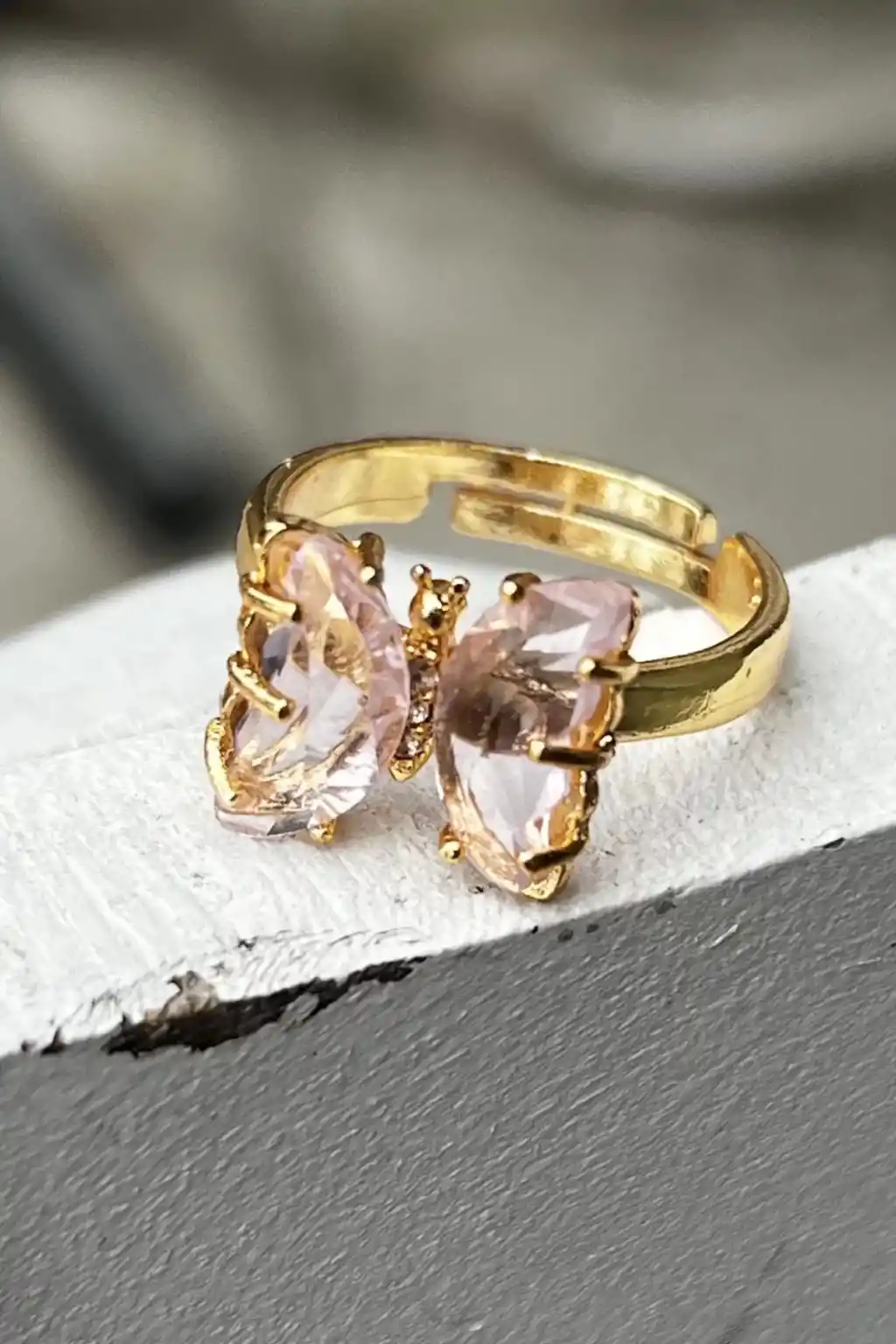 Altın renginde tasarlanmış küçük boy pembe kelebek figürü bulunan bu yüzük, zarif ve şık bir görünüm sunar. Ayarlanabilir yapısı sayesinde farklı parmak ölçülerine uyum sağlar.