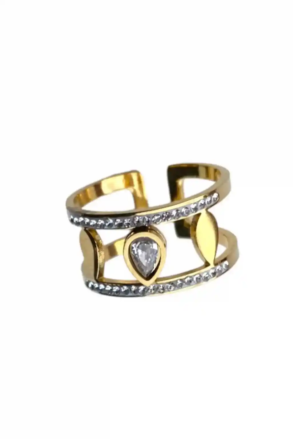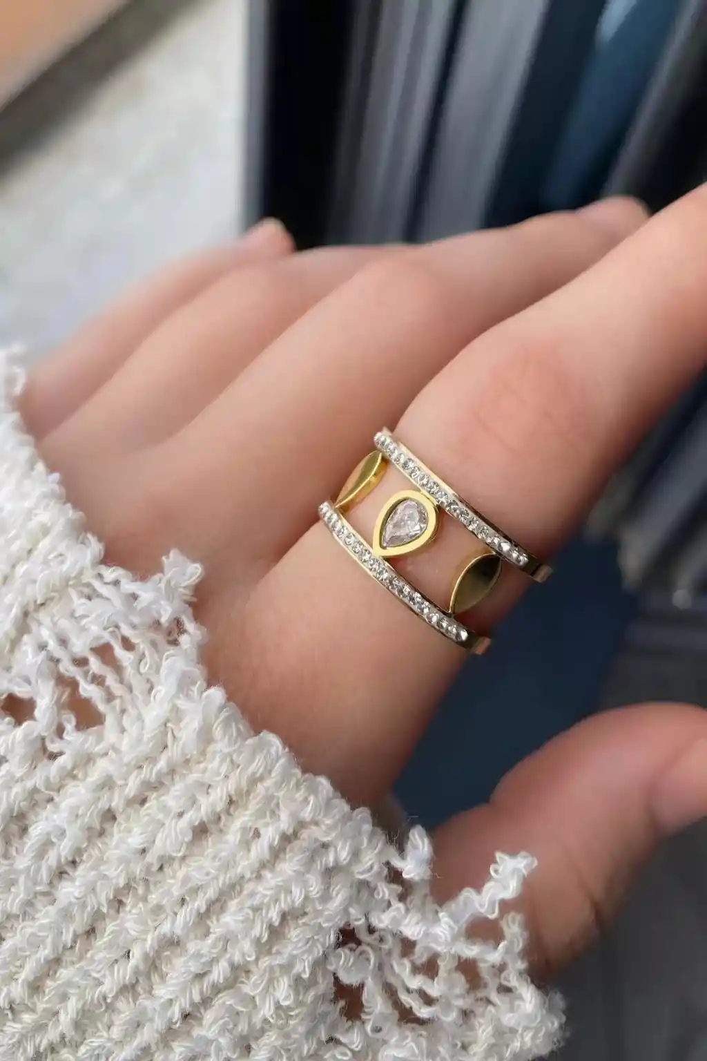 Altın renkli taş detaylarıyla şık ve modern bir görünüm sunar.; Paslanmaz çelik malzemesiyle uzun ömürlü kullanım vaat eder.; Ayarlanabilir yapısı sayesinde farklı parmak boyutlarına kolayca uyum sağlar.; Günlük kullanım için idealdir ve rahatlıkla kombinleyebileceğiniz bir aksesuardır.; Hem günlük hem de özel günlerinizde tarzınıza sofistike bir dokunuş katar.;