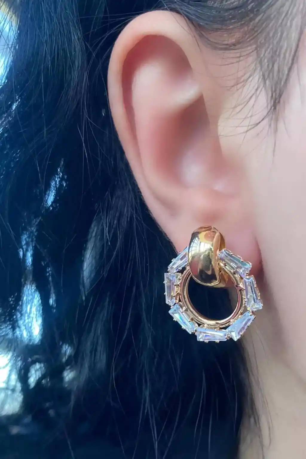 Küpelerdeki taş detayları, parıltısıyla dikkat çeker.