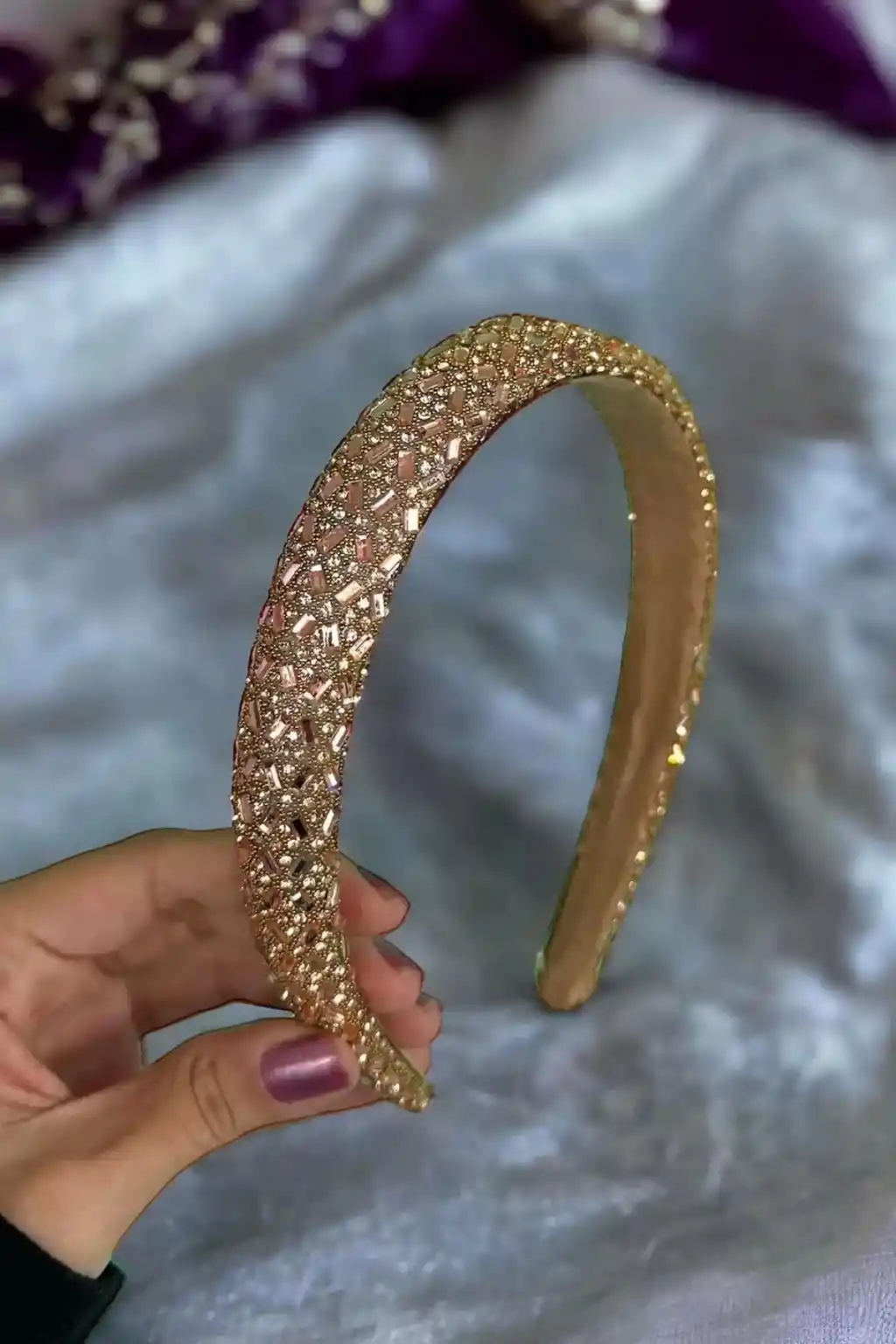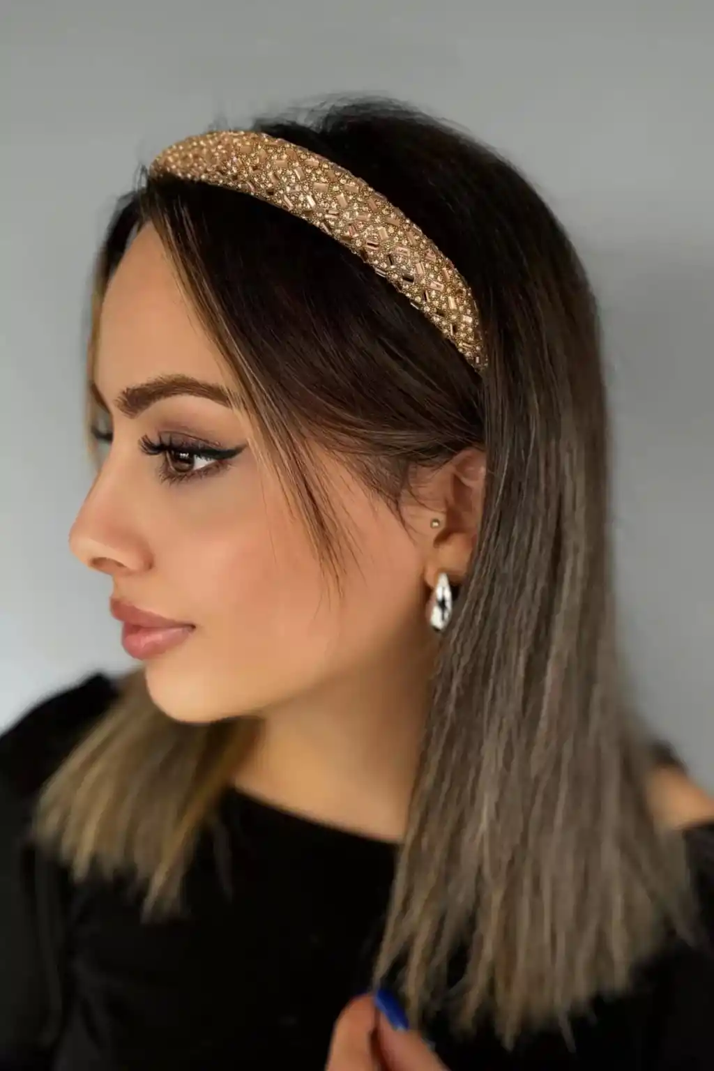 Altın Renk Taşlı Özel Tasarım Taç, zarafet ve ışıltıyı buluşturan bir saç aksesuarıdır. Özel günlerde veya günlük kullanımda tarzınıza şıklık katmak için ideal bir seçenektir.