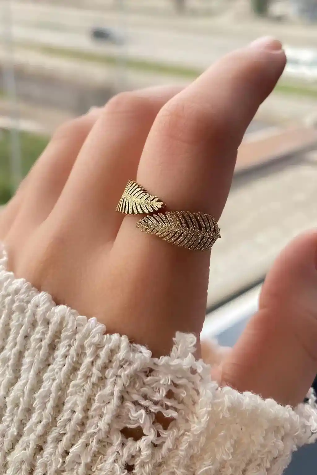 Dayanıklı çelik materyal kullanılarak üretilmiş, uzun ömürlü bir aksesuar deneyimi sunar; Altın rengi yaprak detayları ile şıklığı ve zarafeti parmaklarınıza taşır; Ayarlanabilir yapısı sayesinde farklı parmak ölçülerine kolayca uyum sağlar ve rahat bir kullanım sunar; Hem günlük kullanım hem de özel günler için ideal bir aksesuar seçeneği olarak dikkat çeker;