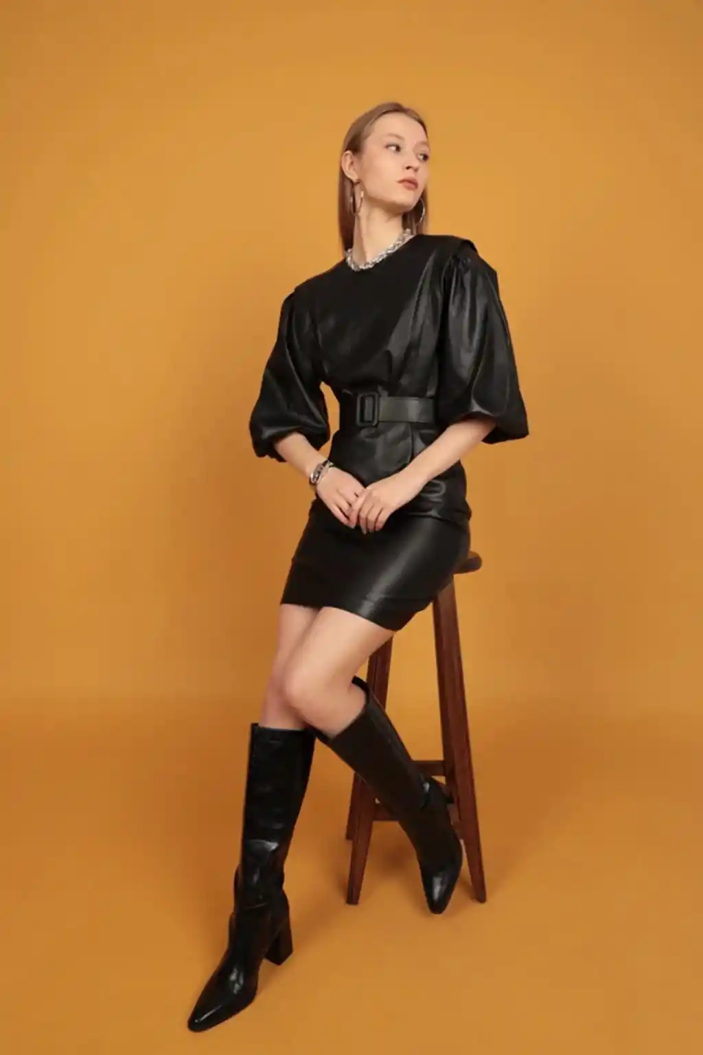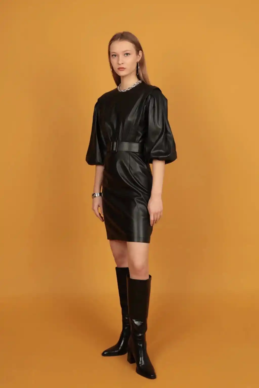 Balon Kollu Kemerli Deri Elbise, stil sahibi kadınlar için mükemmel bir seçim olarak dolabınıza zarif bir dokunuş ekliyor. Bu şık elbise, modern ve sofistike tasarımıyla dikkat çekiyor.
