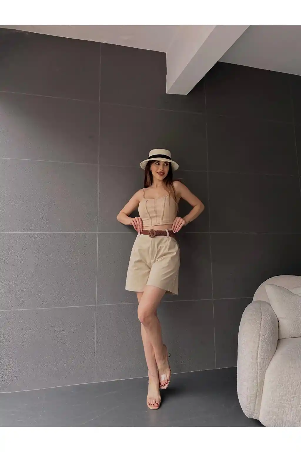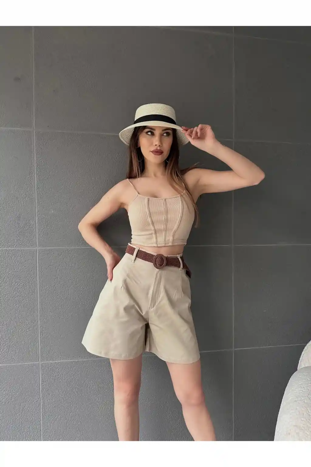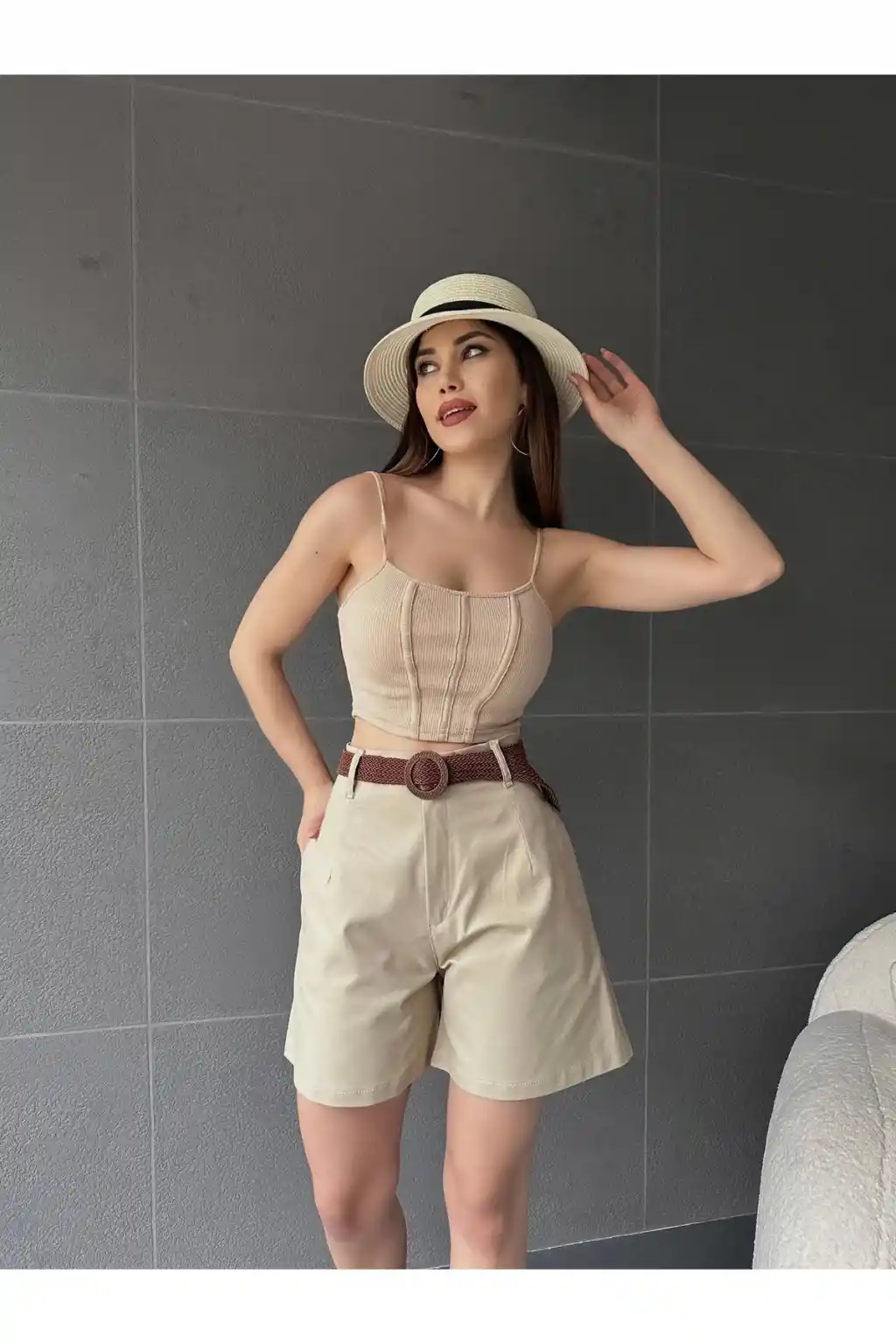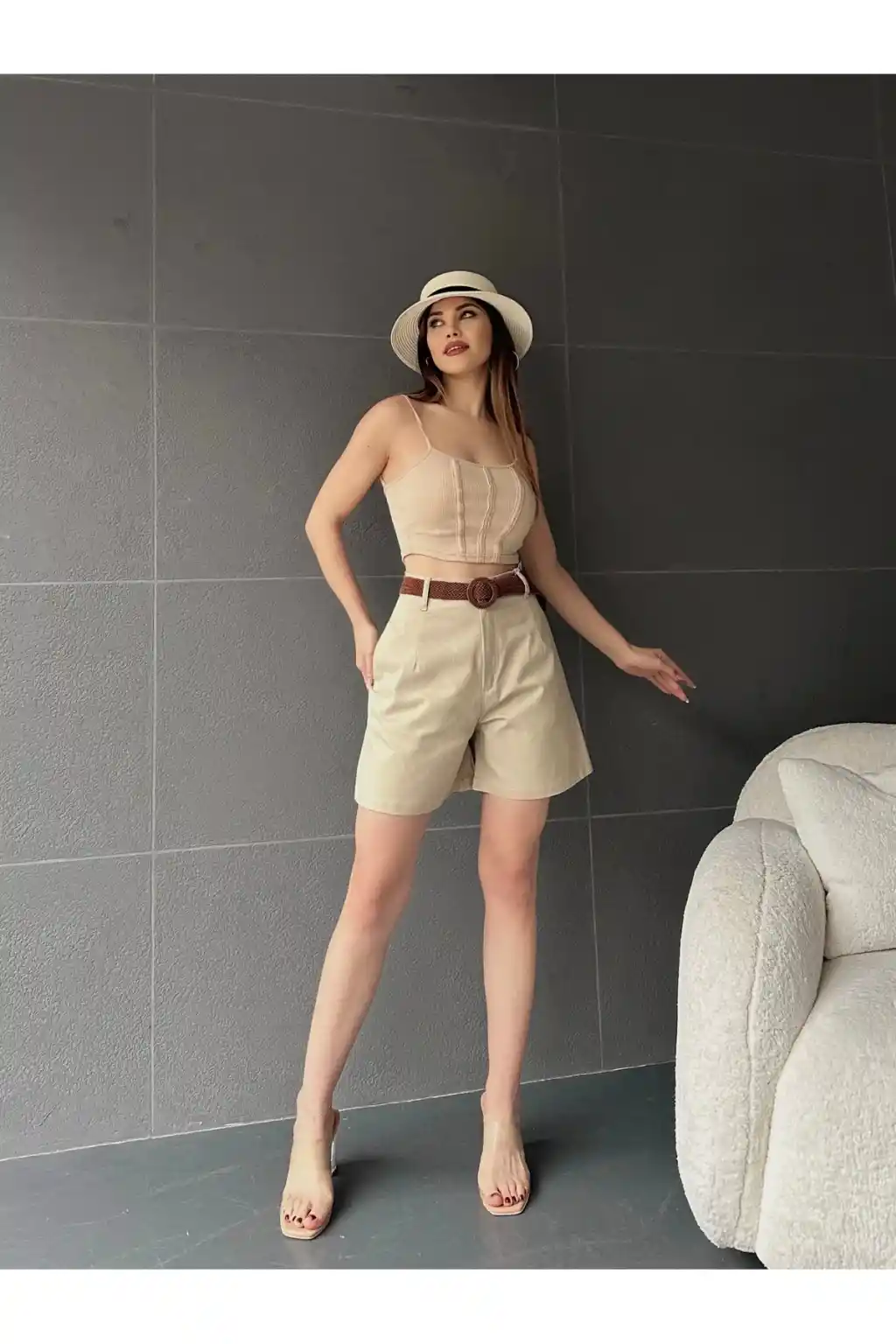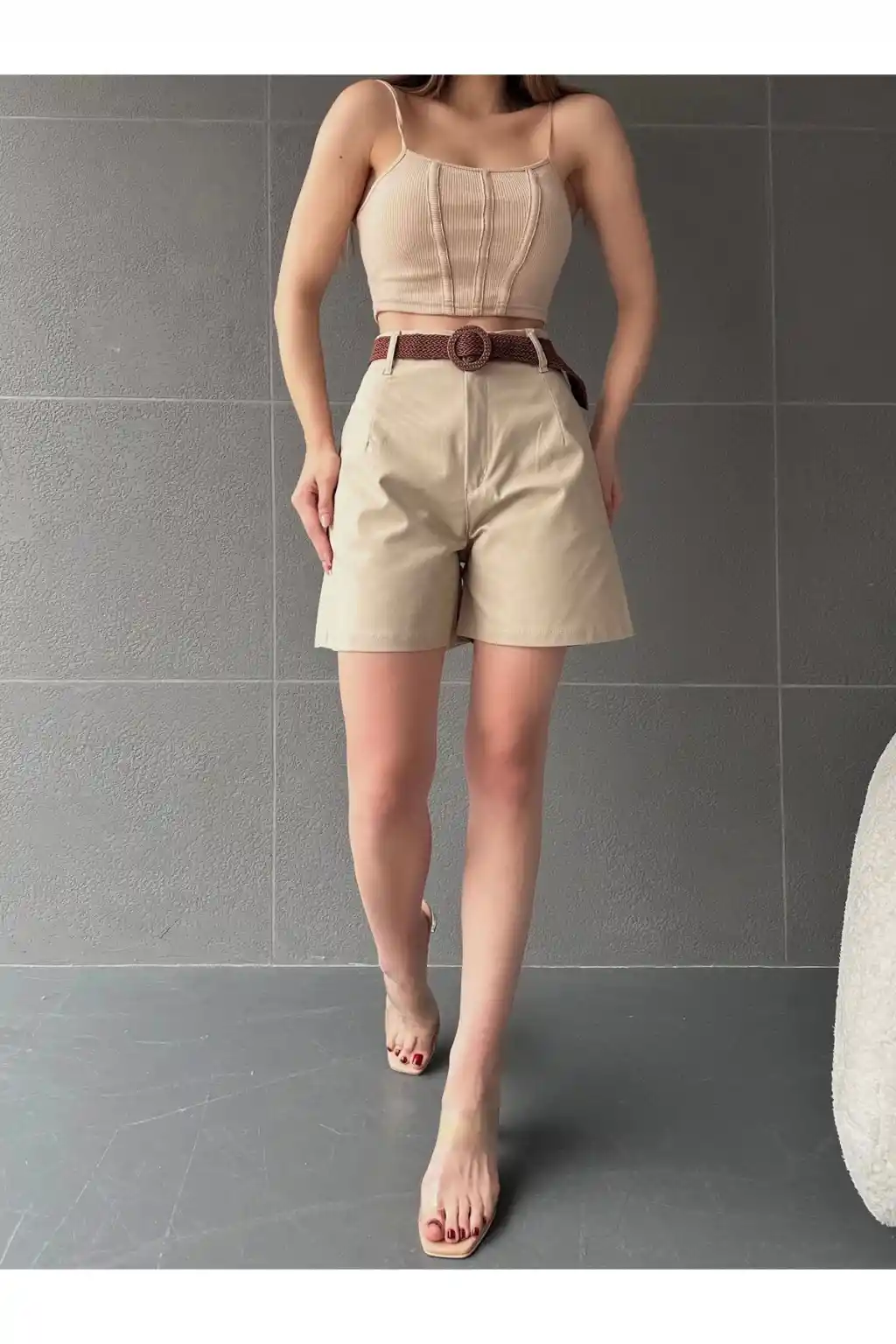 Suni Deri Kemerli Boyfriend Şort Krem