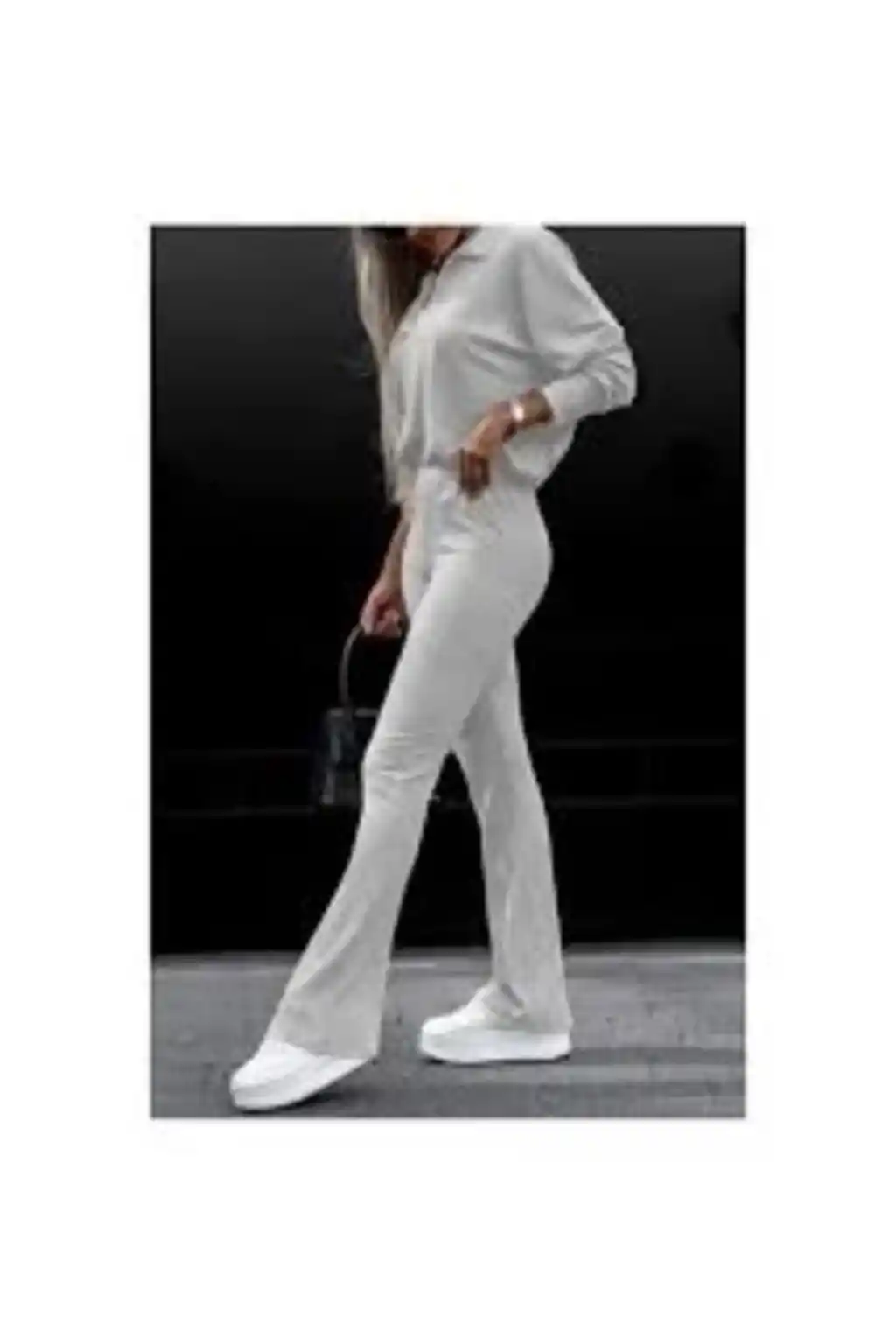 Ispanyol paça kesimine sahip pantolon ise vücudu saran tasarımıyla modern bir hava yaratıyor. Bel kısmındaki lastik detayı sayesinde rahatlıkla uyum sağlarken, paça kısmındaki volan detayıyla da feminen bir dokunuş katıyor.