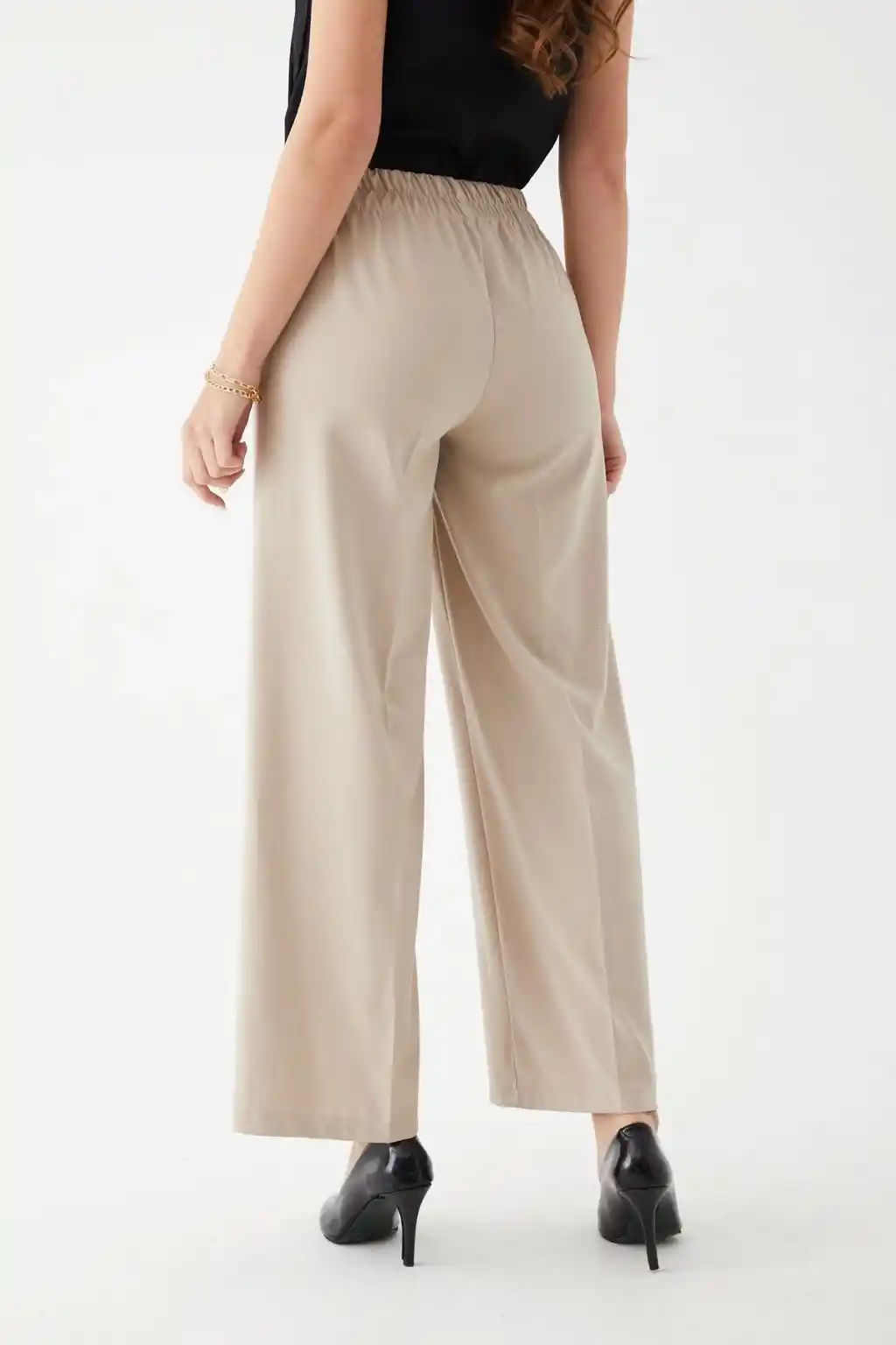 Bacak kısmından bollaşarak geniş paça detayı sunar.