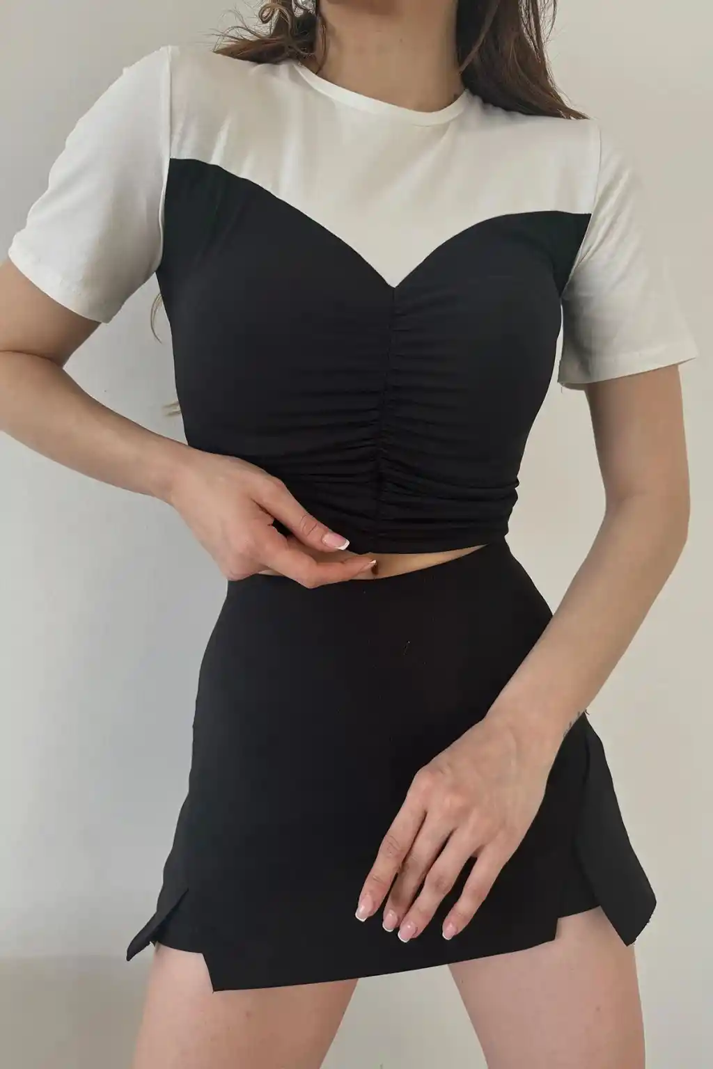- Orta kalınlıkta dokuma kumaşı ile mevsim geçişlerinde ideal bir konfor sunar.; - Astar gerektirmeyen yapısı sayesinde rahat bir kullanım sağlar ve ekstra konfor sunar.; - Büzgülü detayları ile feminen ve şık bir görünüm kazandırır.; - Baskısız tasarımı, sade ve modern bir stil arayanlar için idealdir.; - Düz kesimi sayesinde vücut hatlarını zarifçe sararak feminen bir siluet oluşturur.; - İlkbahar ve sonbahar sezonlarına uygun renk blokları ile canlı ve dinamik bir görünüm sağlar.; - Super crop boyu ile modern ve trend bir görünüm elde edilirken, slim kalıbı vücut hatlarını nazikçe sarar.; - Genç ve dinamik kadınların enerjisini yansıtan tasarım, genç yaş grubuna hitap eder.; - Kısa kollu yapısıyla serin günlerde rahatlık sağlar ve günlük kullanım için uygundur.; - Bisiklet yaka tasarımı ile sade ve şık bir boyun çizgisi sunar.; - Renk blokları sayesinde dikkat çekici ve canlı kombinler oluşturmak mümkündür