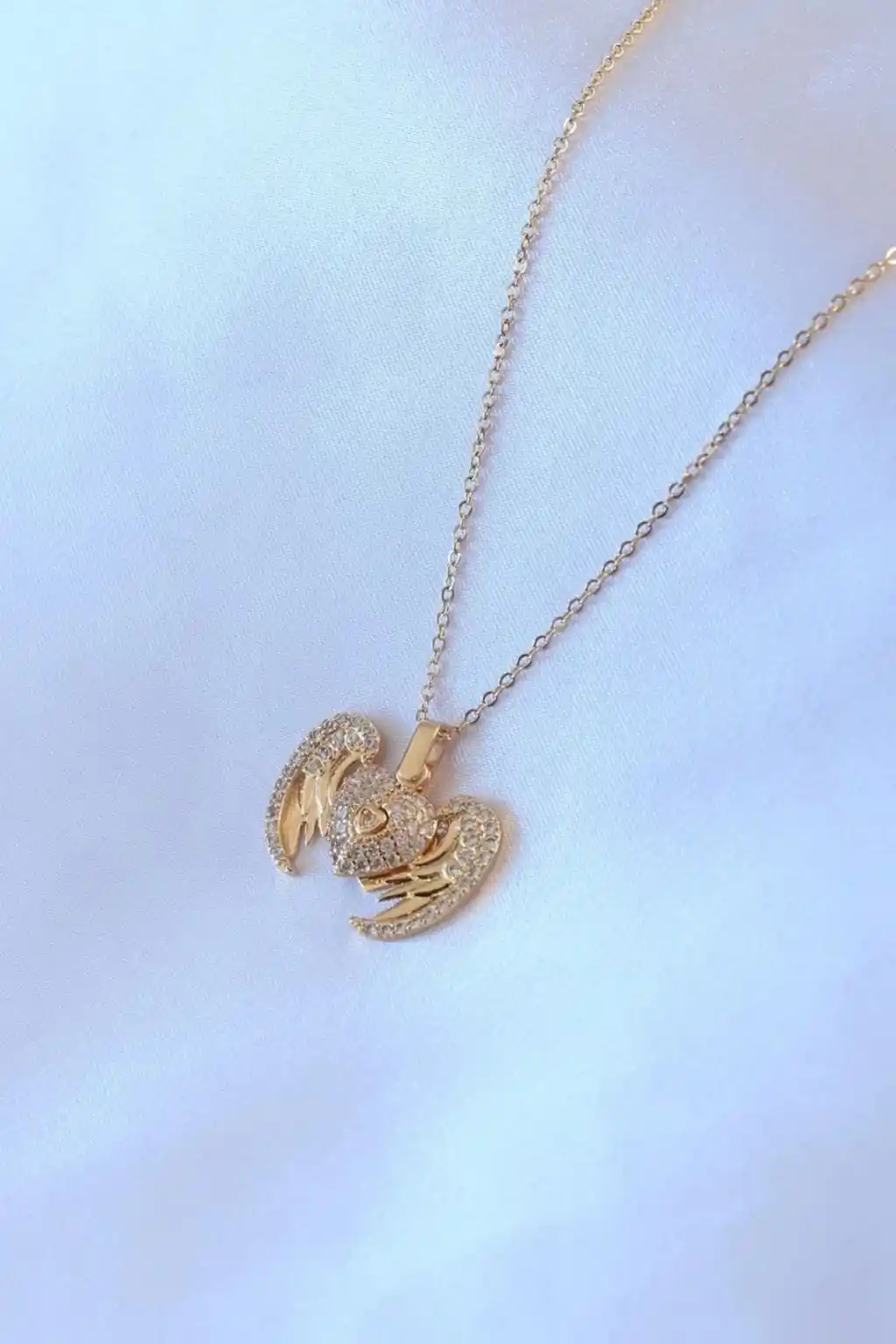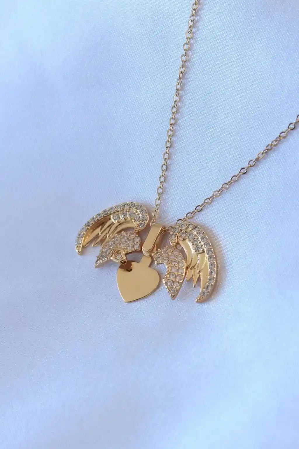 Gold renkli çelikten üretilmiş, açılır tarzıyla şıklığı ve işlevselliği bir arada sunan Zirkon taşlı kanatlı kalp model kadın kolye, tarzınıza zarif bir dokunuş katacaktır. İnce işçilik ve kaliteli malzeme ile tasarlanmış bu kolye, günlük kullanım için ideal bir aksesuardır.