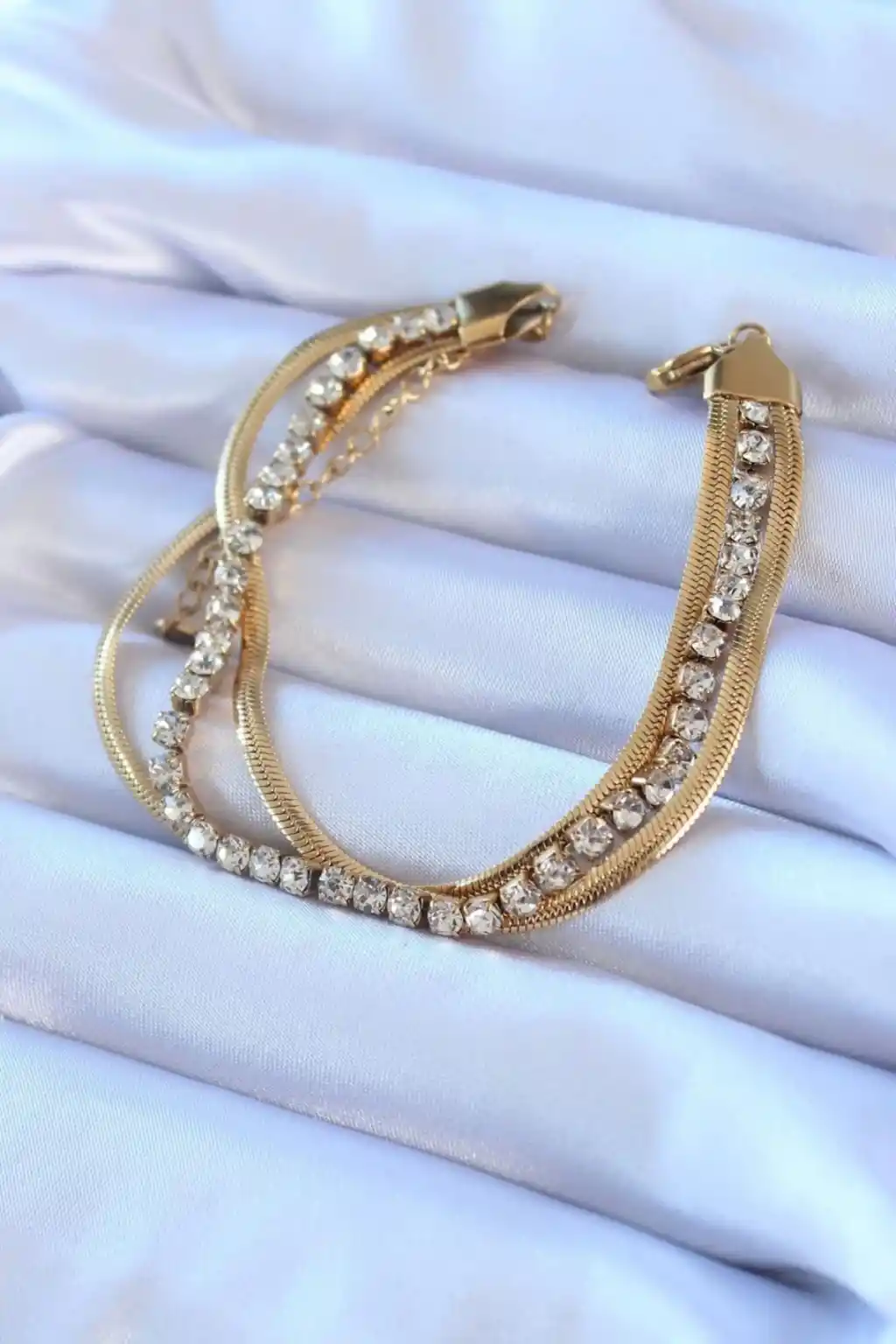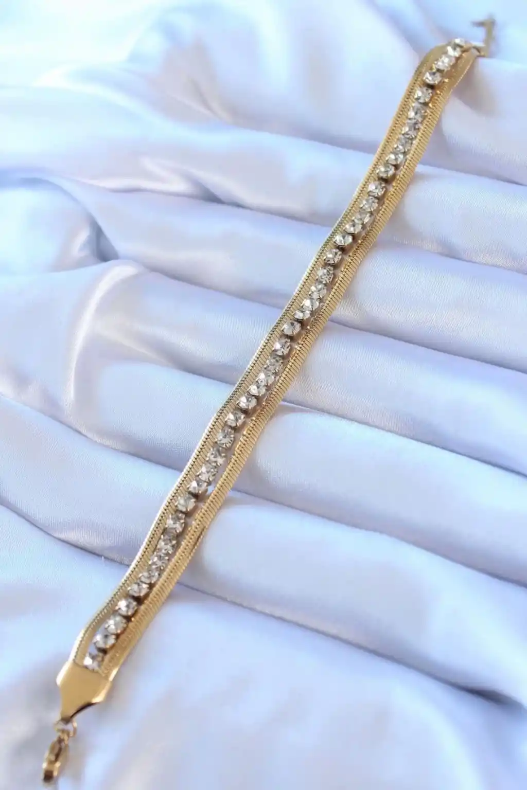 Çelik Gold Renk İtalyan Zincir Model Zirkon Taşlı Kadın Bileklik