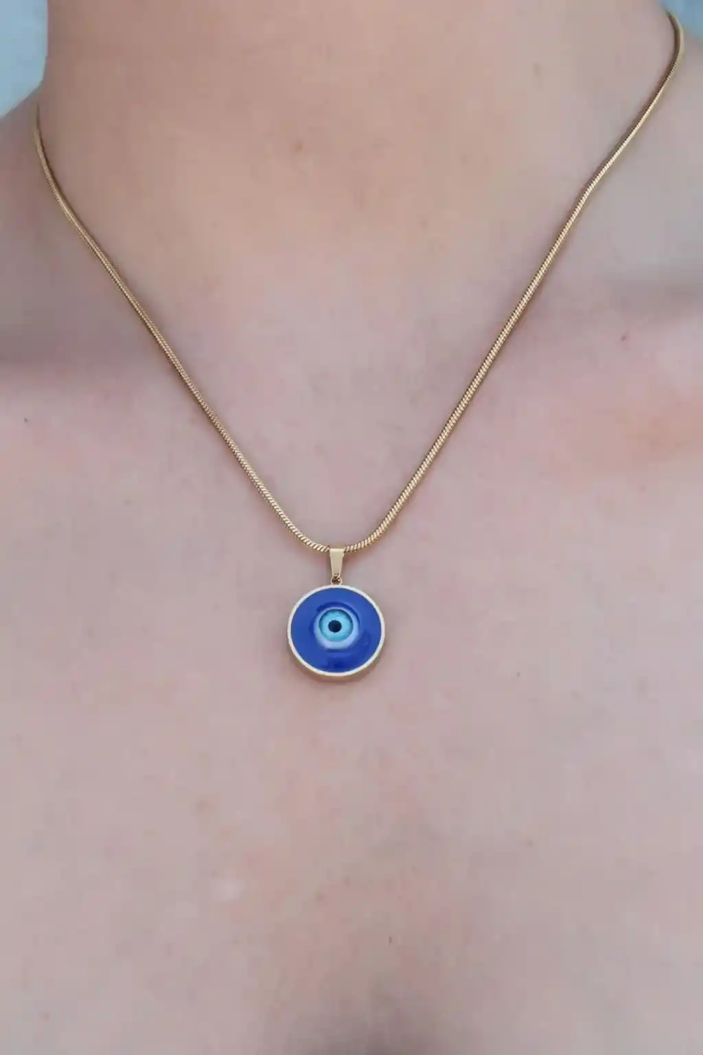 Çelik Gold Renk Nazar Boncuk Model Kadın Kolye, şıklığı ve şansı bir arada sunar. İnce işçilikle hazırlanan nazar boncuğu detayı, kötü enerjilerden korunmanıza yardımcı olur.