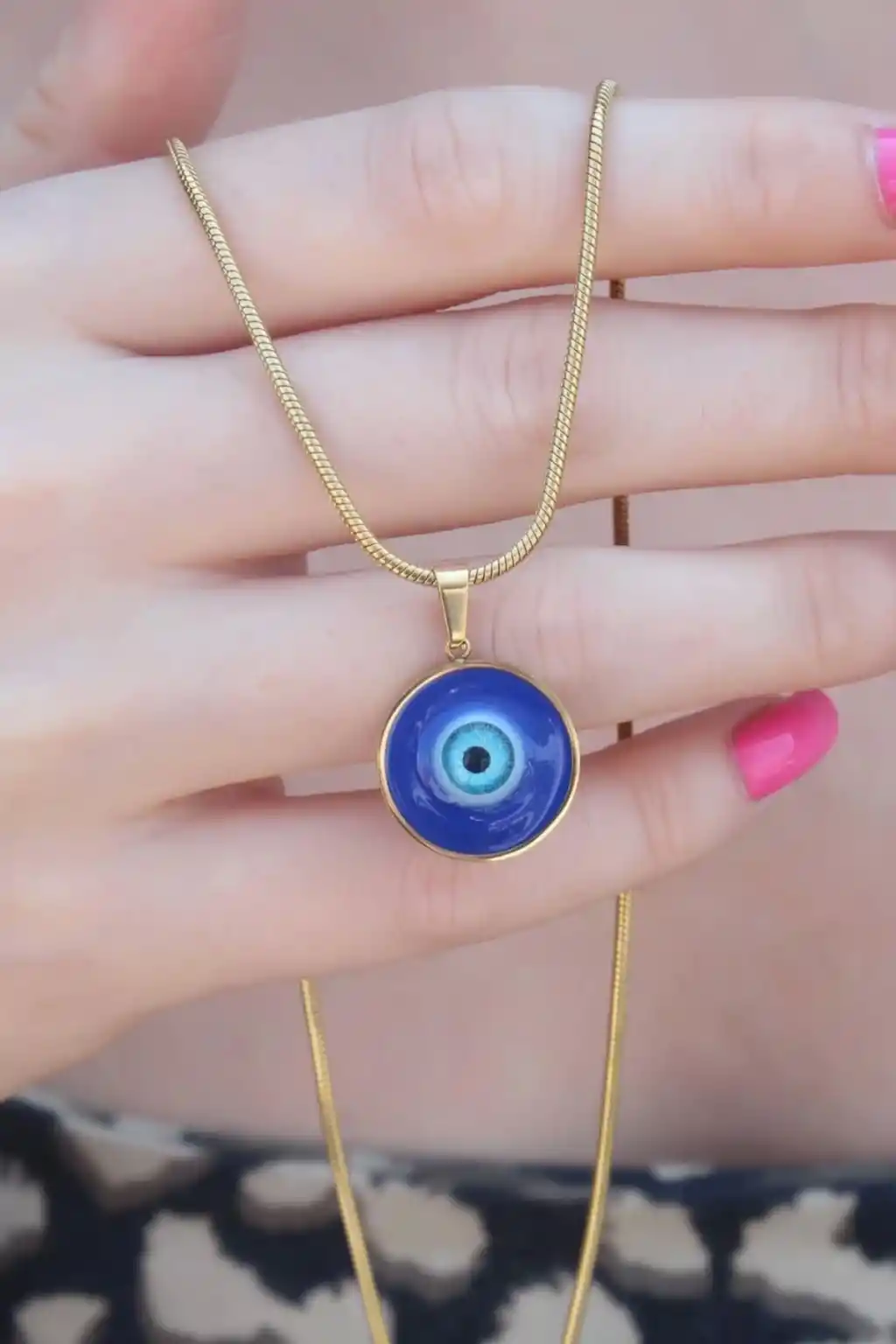Çelik Gold Renk Nazar Boncuk Model Kadın Kolye, hem stilinizi tamamlar hem de size ek bir koruma sağlar. Bu özel kolyeyi sevdiklerinize hediye olarak da düşünebilirsiniz.
