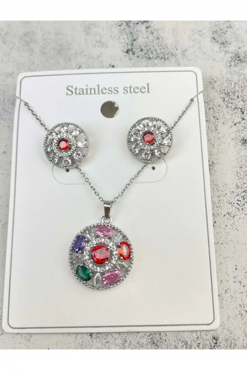 Zirkon taş detayları ile göz alıcı bir parlaklık sunar, her ortamda dikkat çekici bir stil oluşturmanıza olanak tanır.; Paslanmaz çelik malzeme kullanımı sayesinde, günlük kullanıma uygun olup uzun süreli dayanıklılık sağlar ve kararmaya karşı dirençlidir.; Kolye ve küpe set olarak tasarlanmış bu takım, klasik ve modern çizgileri harmanlayarak şık kombinlerinizin vazgeçilmezi olur.; Zarif tasarımı ve kaliteli malzemeleriyle her kıyafetinizle uyum sağlayarak kendinizi özel hissetmenizi sağlar.;