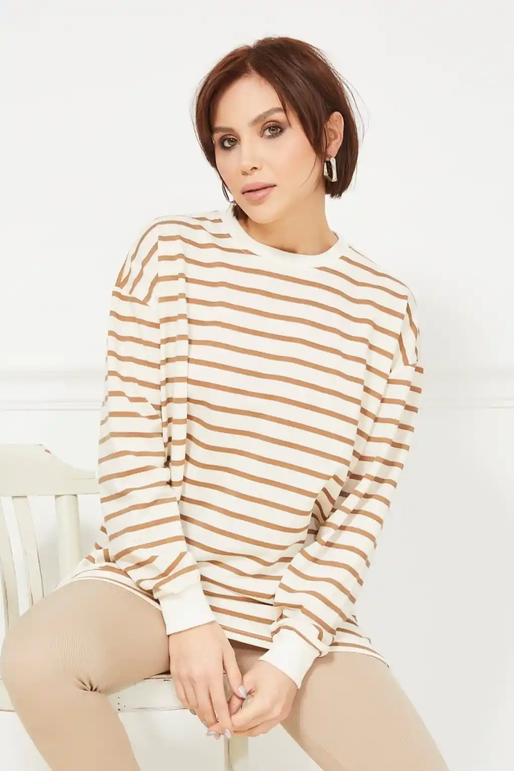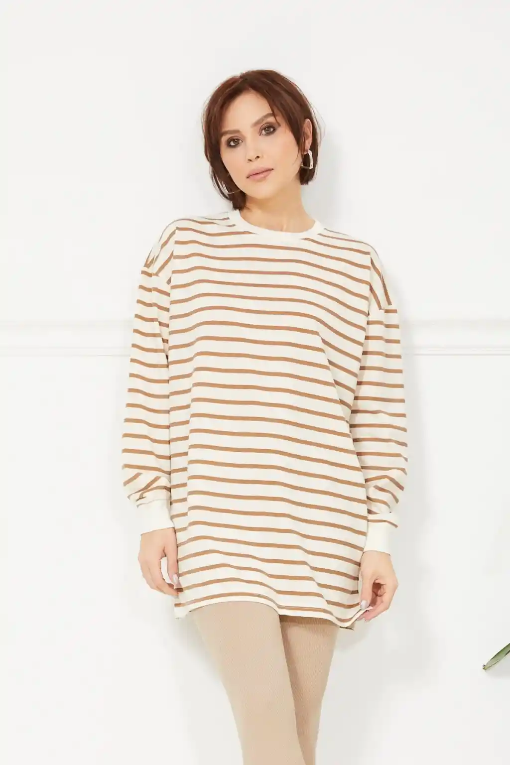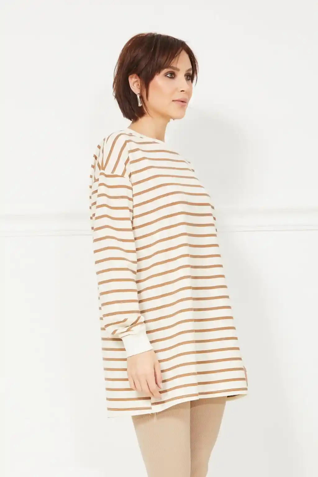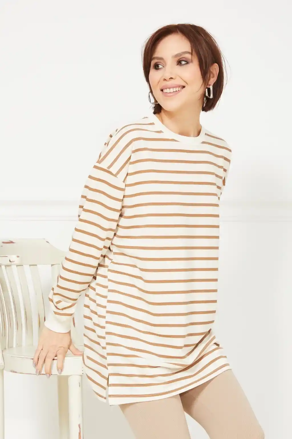 Yırtmaç detayı ile modern ve dinamik bir görünüm sunan çizgili sweatshirt, gün boyu rahatlık ve şıklığı bir arada arayanlar için idealdir.; Standart boy kesimiyle her vücut tipine uyum sağlayan bu sweatshirt, rahatlığı ön planda tutan tasarımıyla dikkat çeker.; Çizgili deseniyle zamansız bir tarza sahip olan bu sweatshirt, farklı kombinlerle kolayca uyum sağlayarak gardrobunuzdaki joker parça haline gelir.; Tüm yaş gruplarına hitap eden geniş kullanım yelpazesi ile herkes tarafından tercih edilebilecek bir üründür.; Regular silueti sayesinde ne çok dar ne de çok bol, tam oturan yapısıyla konforlu bir kullanım sunar.; Regular kalıbı, hareket özgürlüğünüzü kısıtlamadan gün boyu rahat etmenizi sağlar.; Dokuma kumaş tipi, dayanıklılığı artırarak uzun süreli kullanım imkanı verirken aynı zamanda nefes alabilir yapısıyla konforunuzdan ödün vermezsiniz.;