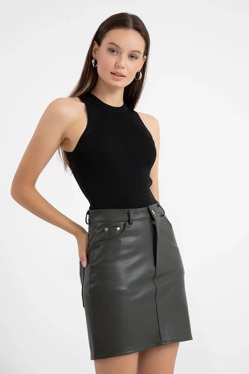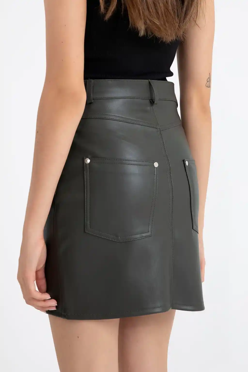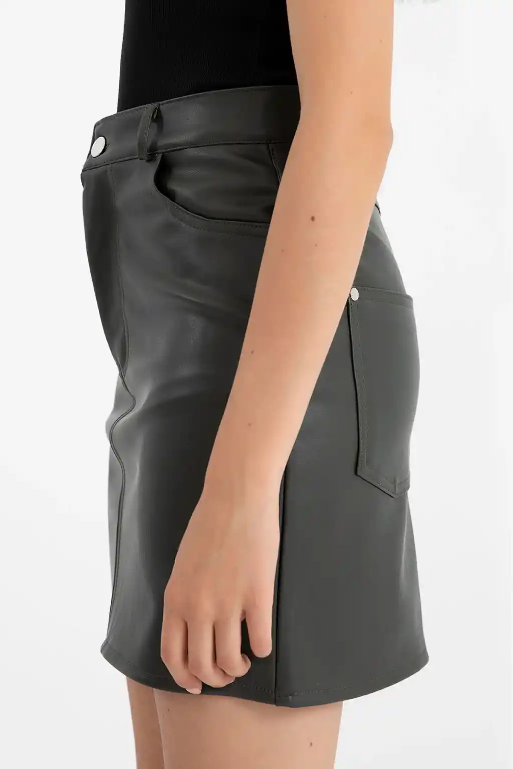 Mini boy kesimi ile modern ve şık bir görünüm sunar; Suni deri kumaşı, dayanıklılığı ve zarif dokusuyla dikkat çeker; Dar kalıbı sayesinde vücut hatlarınıza mükemmel uyum sağlar ve feminen bir siluet oluşturur;