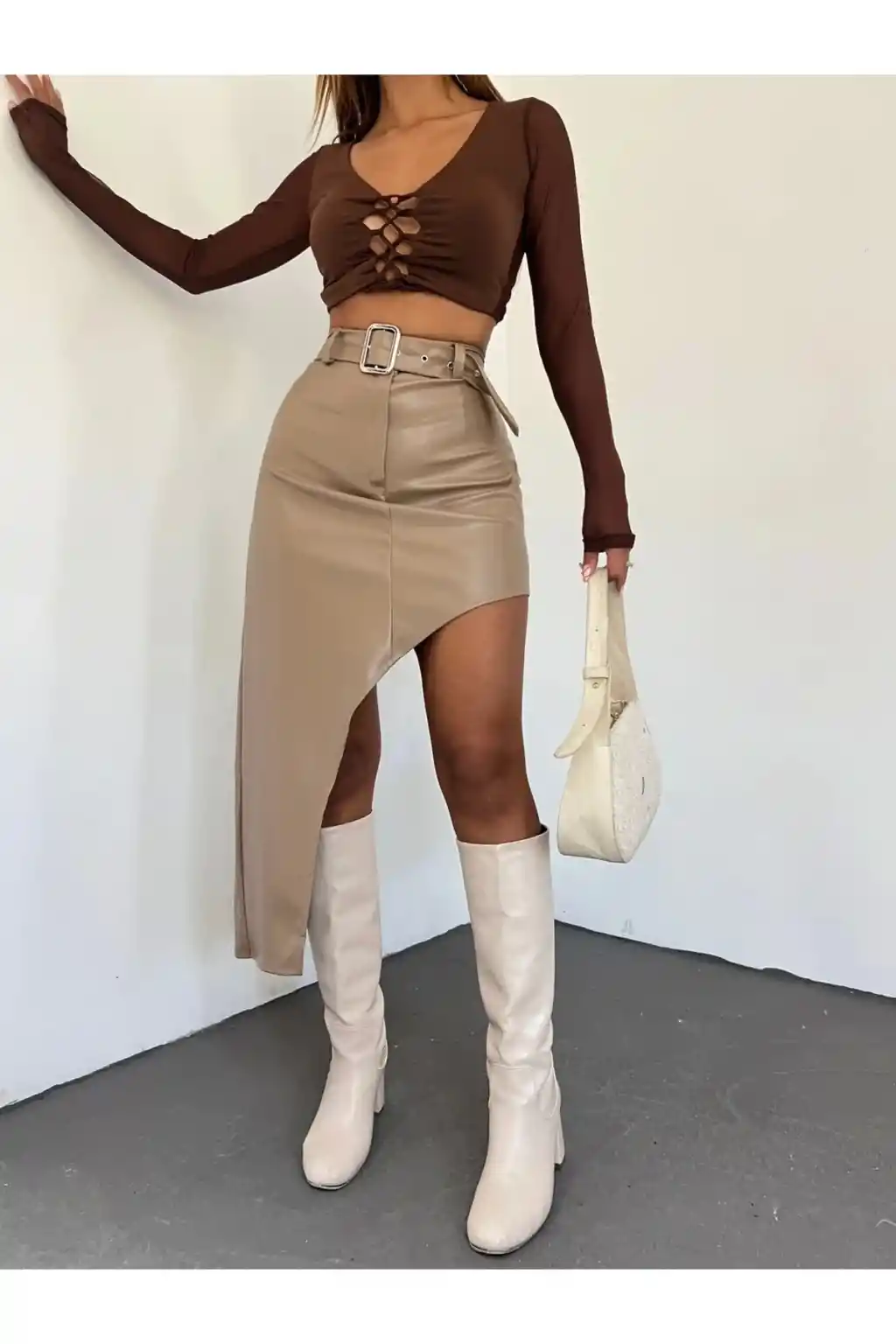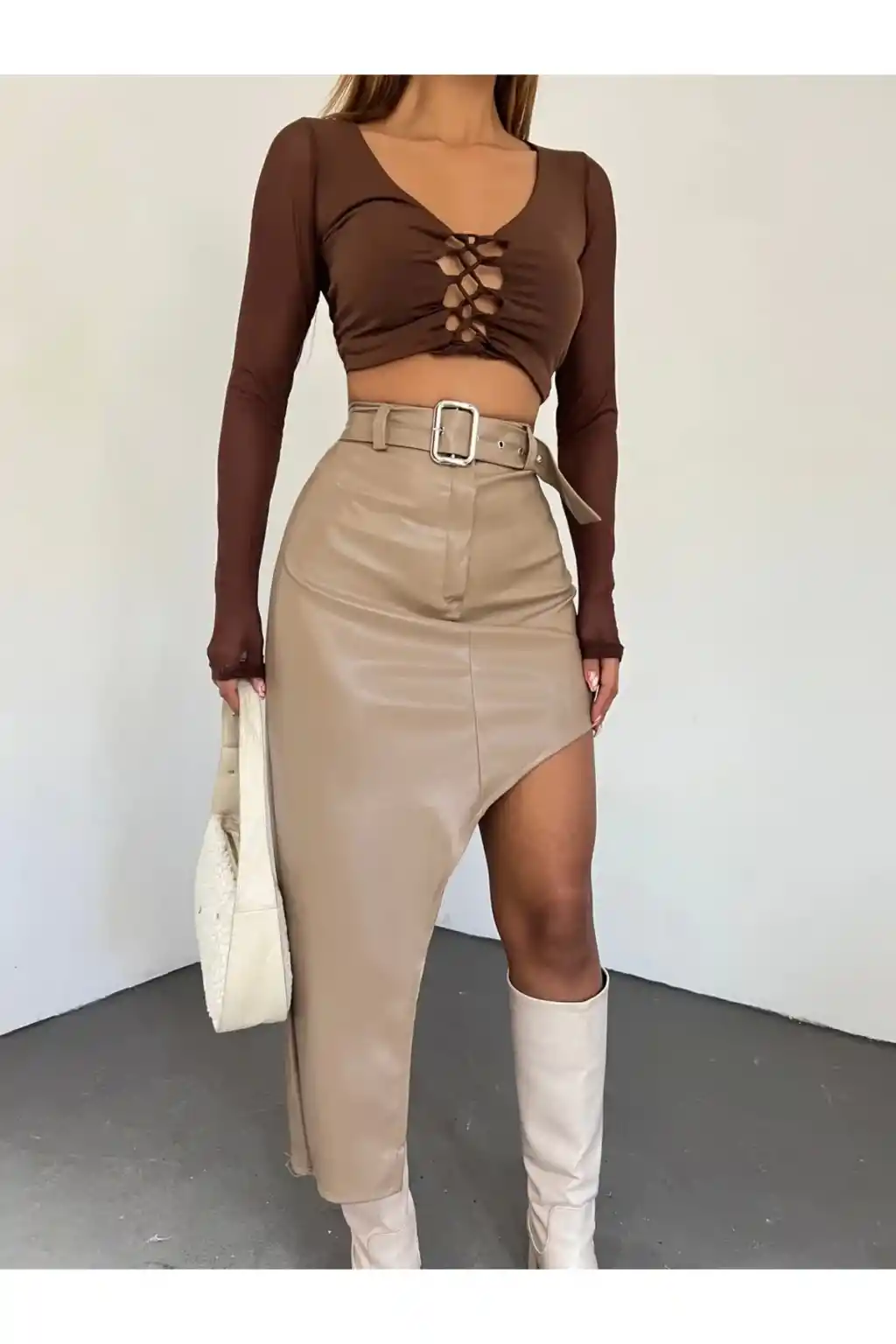 Derin yırtmaç detayı ve kemer detayıyla şıklığı yakalayabileceğiniz bu etek, gardırobunuzun vazgeçilmezi olmaya aday!