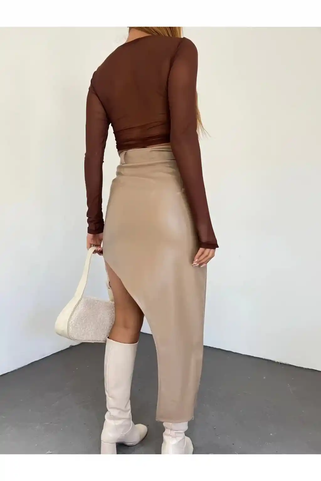 Suni deriden üretilmiş olmasıyla vegan dostu bir seçenek sunan bu etek, tarzınıza modern bir dokunuş katacak.