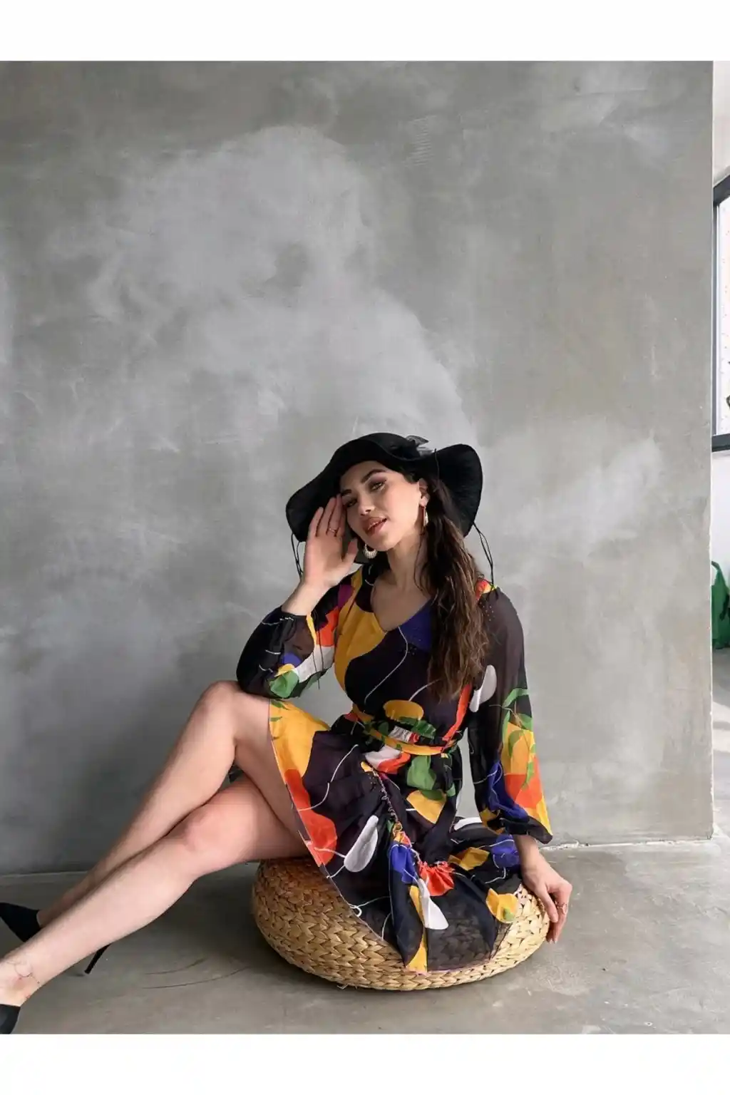 Jaslo Kruvaze Yaka Etek Ucu Volanlı Mini Elbise - Yüksek Kaliteli