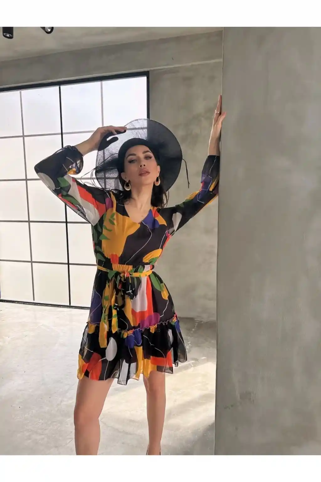 Kruvaze Yaka Etek Ucu Volanlı Mini Elbise