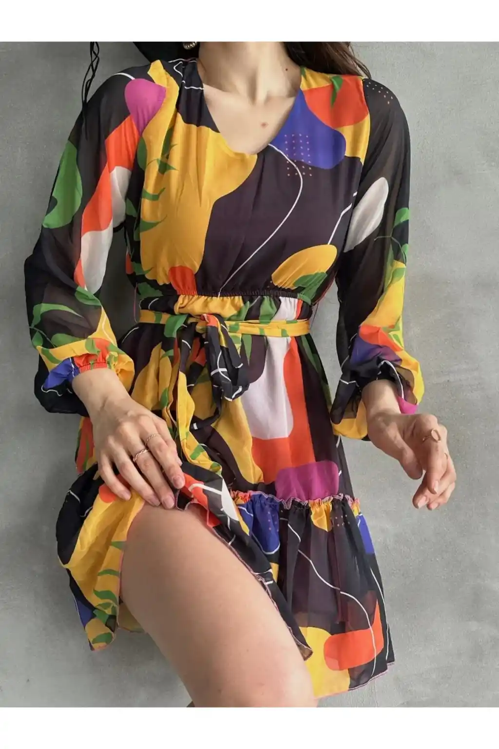 Desenli Astarlı Şifon Elbise SAKS RENK