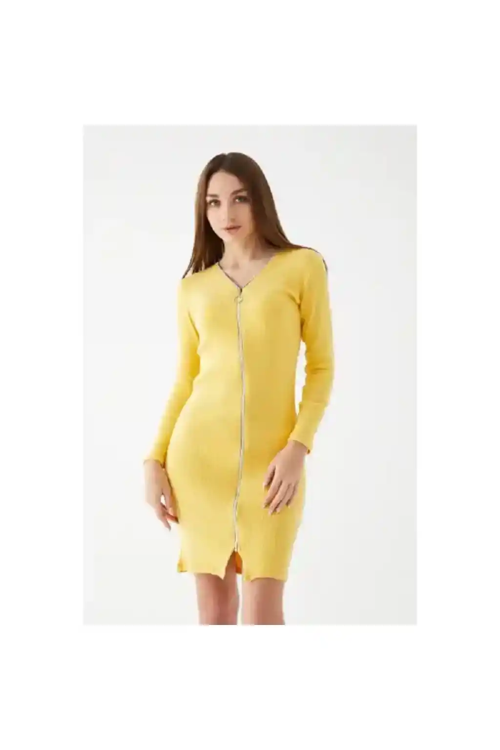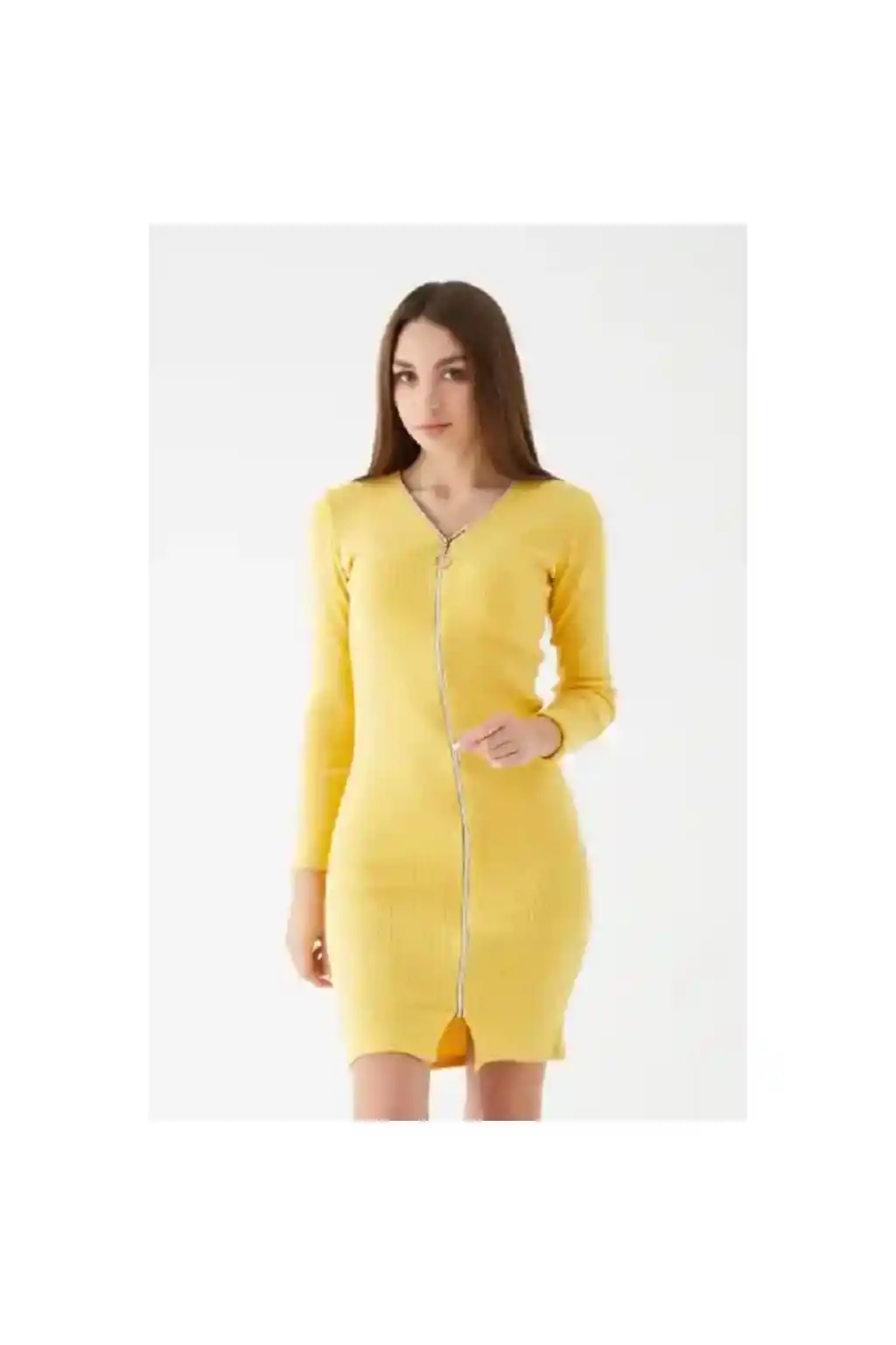 - Gençlerin enerjisini yansıtan sarı renkli fermuarlı elbise, yaz aylarının vazgeçilmezi olacak.; - Belirtilmemiş kumaş tipi sayesinde farklı dokulara uyum sağlayarak her ortamda şıklığınızı korumanızı sağlar.; - Türkiye'de üretilmiş olmasıyla yerel üretim avantajını yanınızda taşıyabilirsiniz.; - Kısa boy tasarımı ile rahat hareket etme özgürlüğü sunarken, modern bir görünüm kazandırır.; - Dar kalıp seçeneğiyle vücut hatlarınıza mükemmel uyum sağlayarak zarif bir siluet oluşturur.