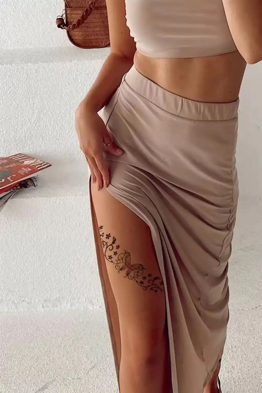- Özel tasarımıyla dikkat çeken bu geçici bel ve bacak dövmesi, kişisel tarzınızı yansıtmanızı sağlar.; - Üretiminde kullanılan yüksek kaliteli malzemeler sayesinde uzun süreli kullanım sunar ve cildinize zarar vermez.; - Kolay uygulanabilir yapısı ile evde veya profesyonel bir ortamda hızlıca yaptırılabilir; zamandan tasarruf ederken estetik görünümünüzden ödün vermezsiniz.; - Menşe ülkesi Türkiye'den gelen bu ürün, yerel sanatçıların yeteneklerini sergileyerek kültürel mirası yansıtır.
