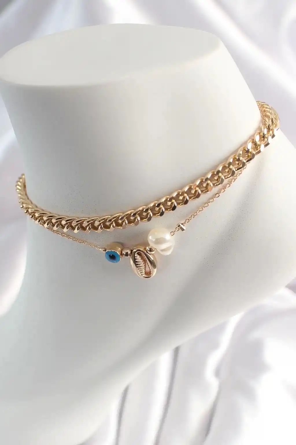 - Göz alıcı altın rengi zincir modeli, zarif tasarımıyla dikkat çeker.; - Deniz kabuğu figürü, deniz temalı aksesuar severler için ideal bir seçimdir.; - Nazar boncuğu detayı ile hem şıklığı hem de koruyuculuğu bir arada sunar.; - Zirkon taş kullanımı, parıltılı bir görünüm kazandırırken dayanıklılığı arttırır.; - Gümüş materyali sayesinde uzun süreli kullanım için idealdir ve kararmaya karşı dirençlidir.; - Bebek ve çocuklar için uygun tasarımıyla miniklerin bile keyifle takabileceği bir aksesuardır.; - Erkekler için de uygun olan bu aksesuar, her yaştan kullanıcıya hitap eder.