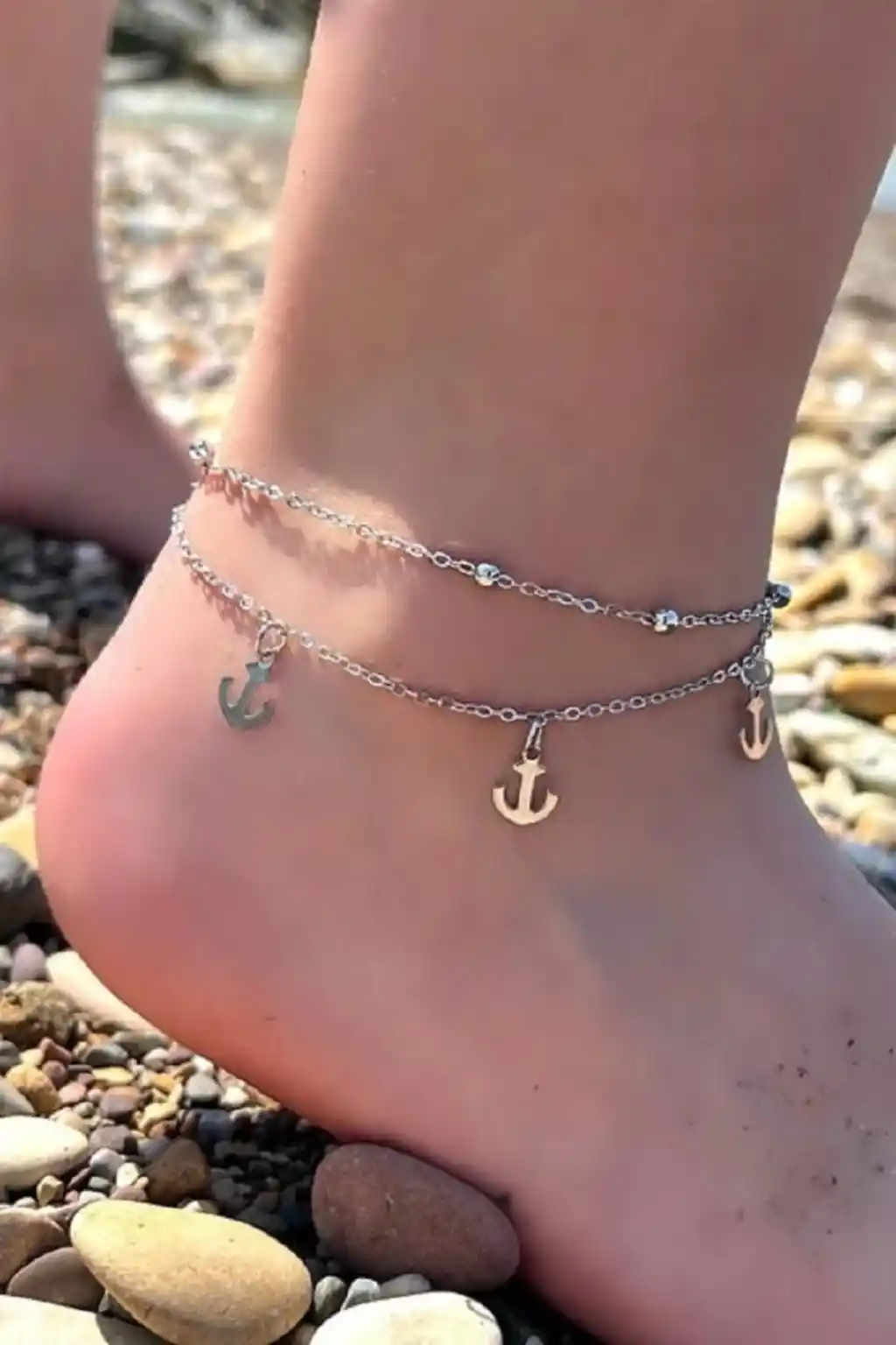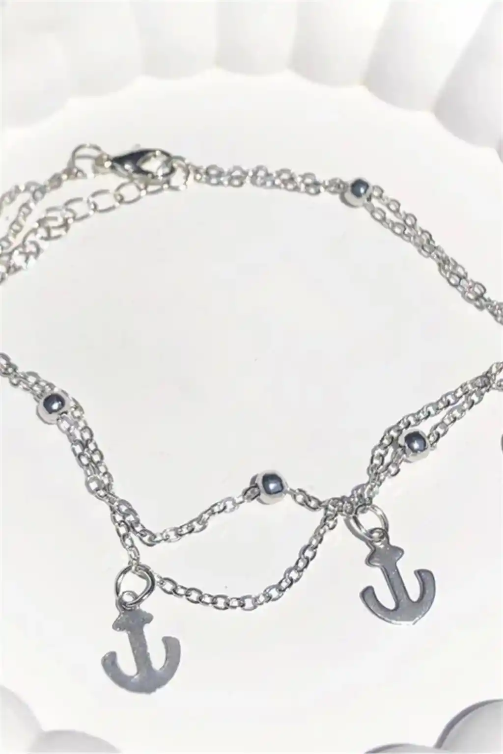 Şık ve modern tasarımıyla dikkat çeken gümüş renkli halhal, günlük kullanımdan özel günlerdeki şıklığınıza eşlik eder.; Çapa figürleriyle süslenmiş ikili zinciri sayesinde hem zarif hem de anlamlı bir aksesuar seçeneği sunar.; Gümüş rengi, her türlü kıyafetle kolayca uyum sağlayarak kombinlerinize sofistike bir dokunuş katar.; Dayanıklı yapısı ile uzun süreli kullanım vaad eden bu halhal, kalitesiyle de ön plana çıkar.; İkili zincir yapısı sayesinde farklı tarzlara uyum sağlayabilir ve kişisel zevkinize göre ayarlanabilir.;