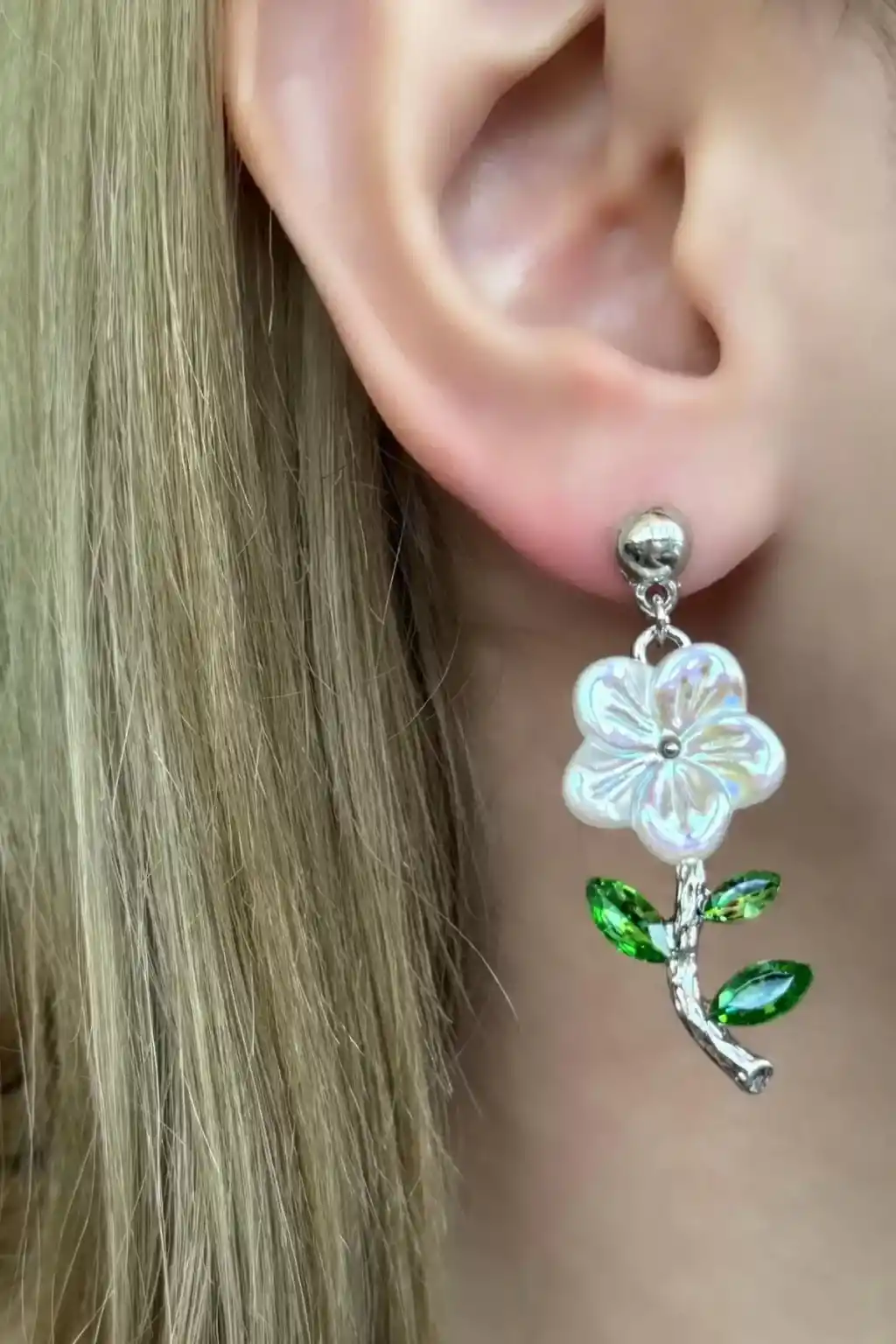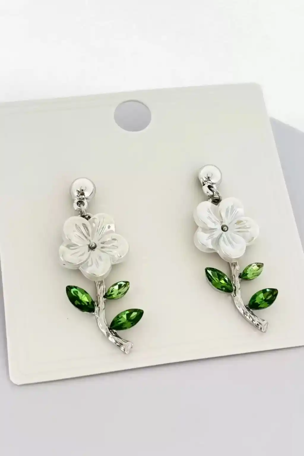 - Zarif tasarımıyla dikkat çeken gümüş renkli çiçek figürlü küpeler, her kıyafetinize şıklık katar.; - Kadın ve kız çocukları için ideal bir aksesuar olan bu çift küpe, özel günlerde veya günlük kullanım için uygundur.; - Standart modeli sayesinde farklı boyut ve tarzlara kolayca uyum sağlar ve rahat bir kullanım sunar.; - Taşlı yapısı ile göz alıcı bir parlaklık ve zarafet katarken, gümüş rengi ile modern bir dokunuş sağlar.