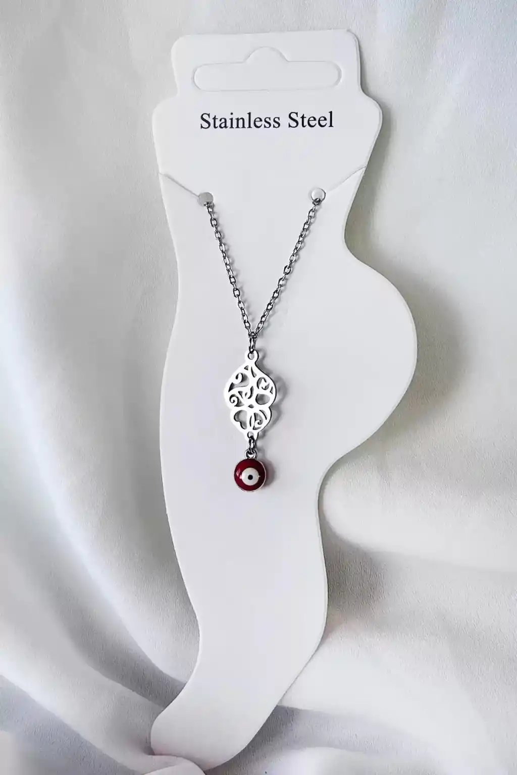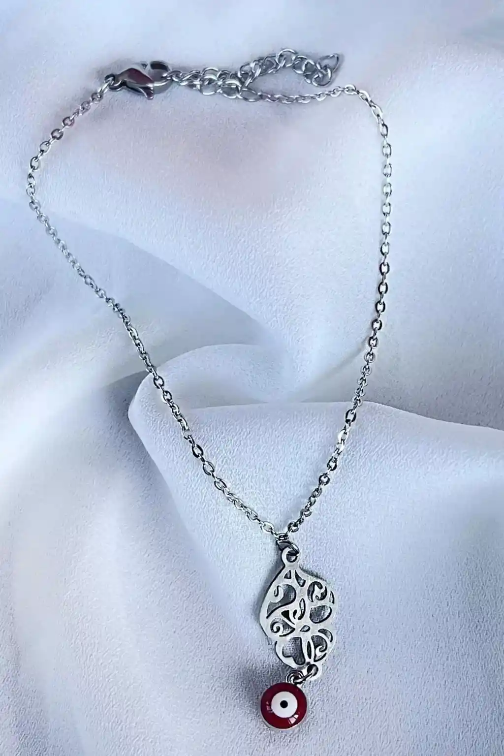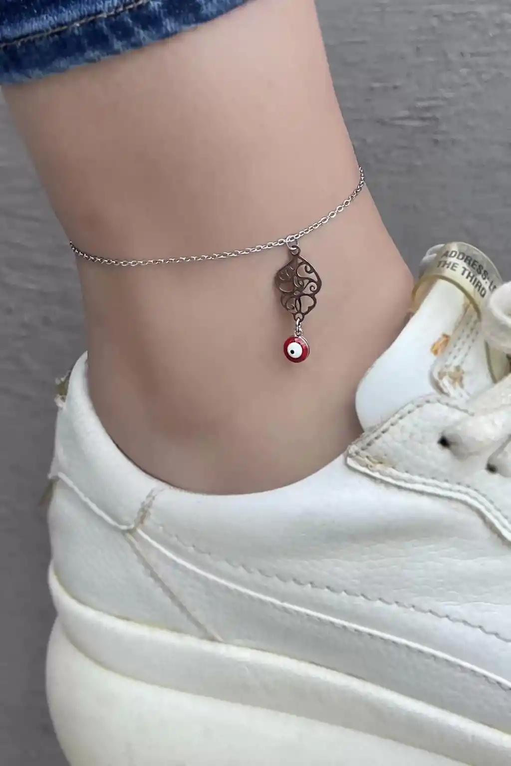 Şık tasarımıyla dikkat çeken gümüş renk nazar boncuk figürlü çelik halhal, günlük kullanımda bileklerinizi süsleyecek zarif bir aksesuardır.; Dayanıklı çelik malzemesiyle uzun süreli kullanım vaat ederken, gümüş rengiyle her türlü kıyafetle kolayca uyum sağlar.; Nazar boncuğu motifleriyle şans getirmesi amaçlanan bu halhal, stilinizi hem modern hem de geleneksel unsurlarla buluşturur.; Kolayca ayarlanabilir yapısıyla farklı bilek ölçülerine uygunluk gösterir ve konforlu bir kullanım sunar.; Özel günlerinizde veya günlük kombinlerinizde fark yaratacak bu halhal, aksesuar koleksiyonunuzun vazgeçilmez parçası olacak.;