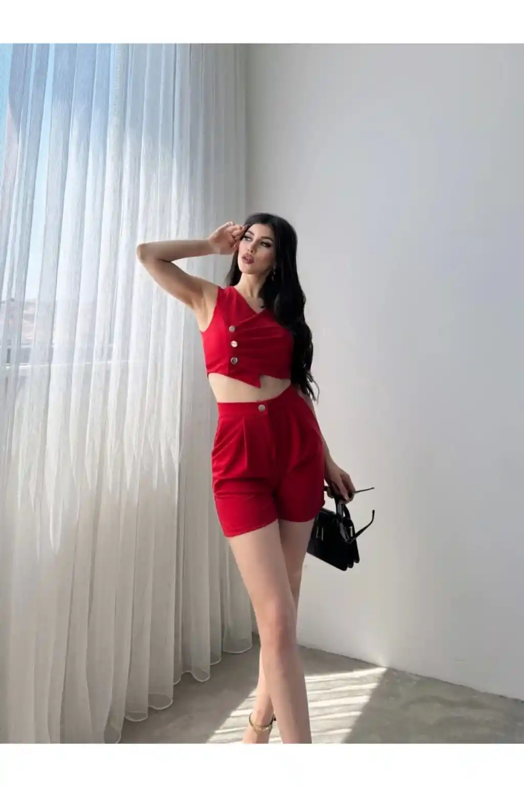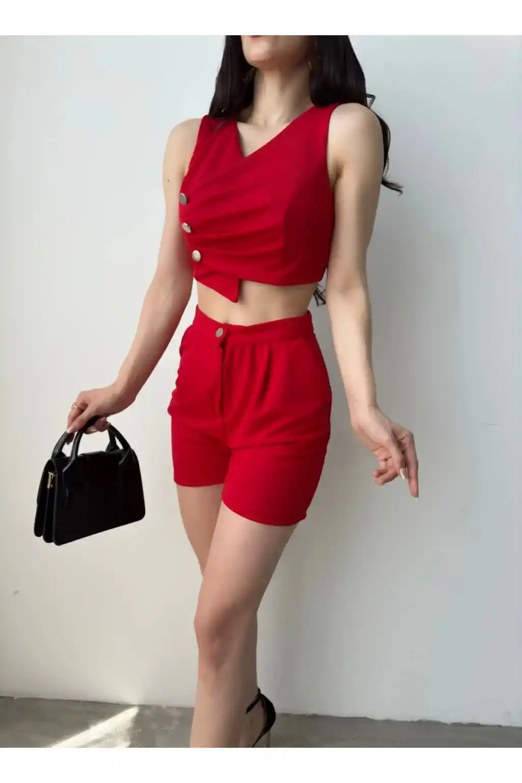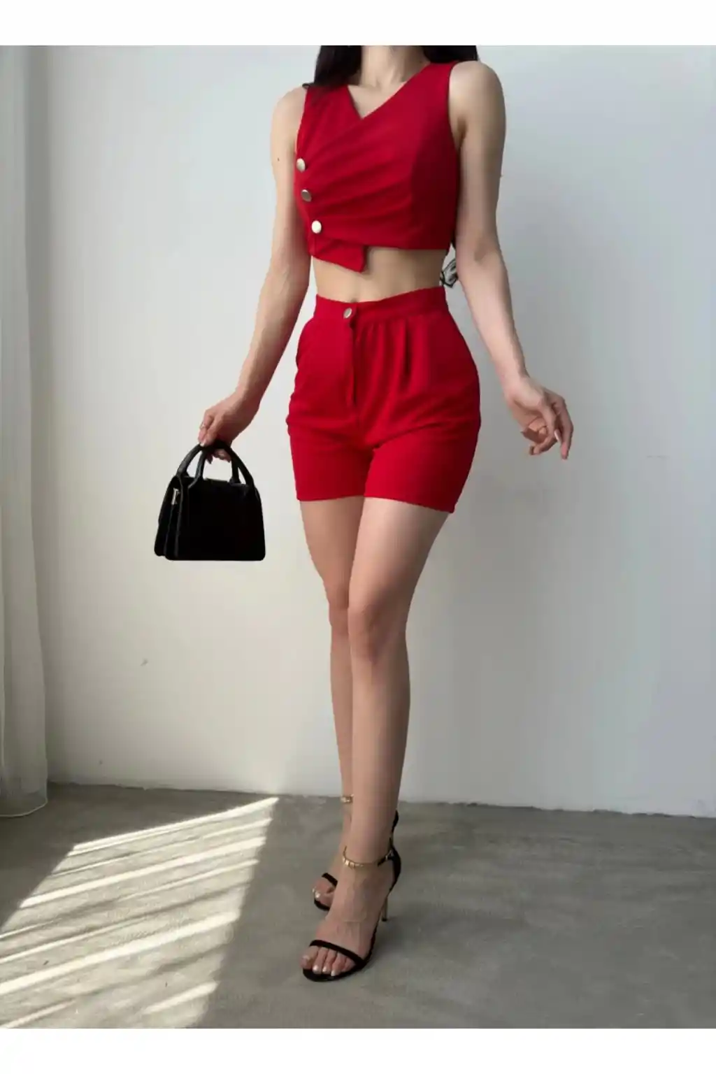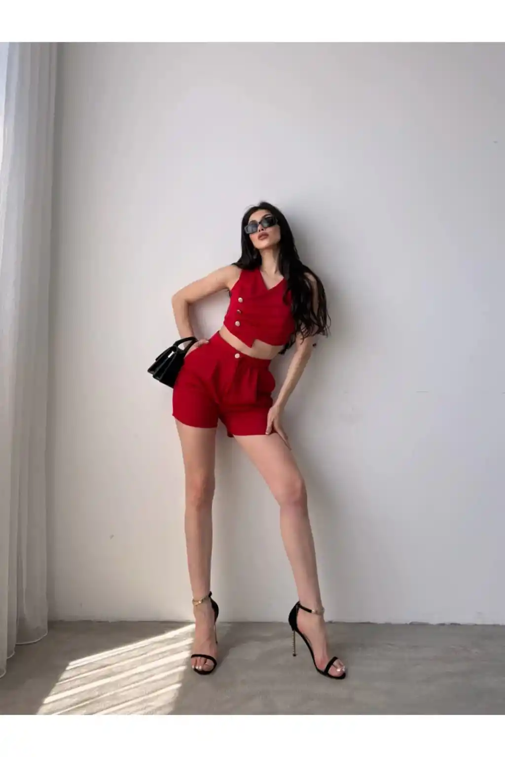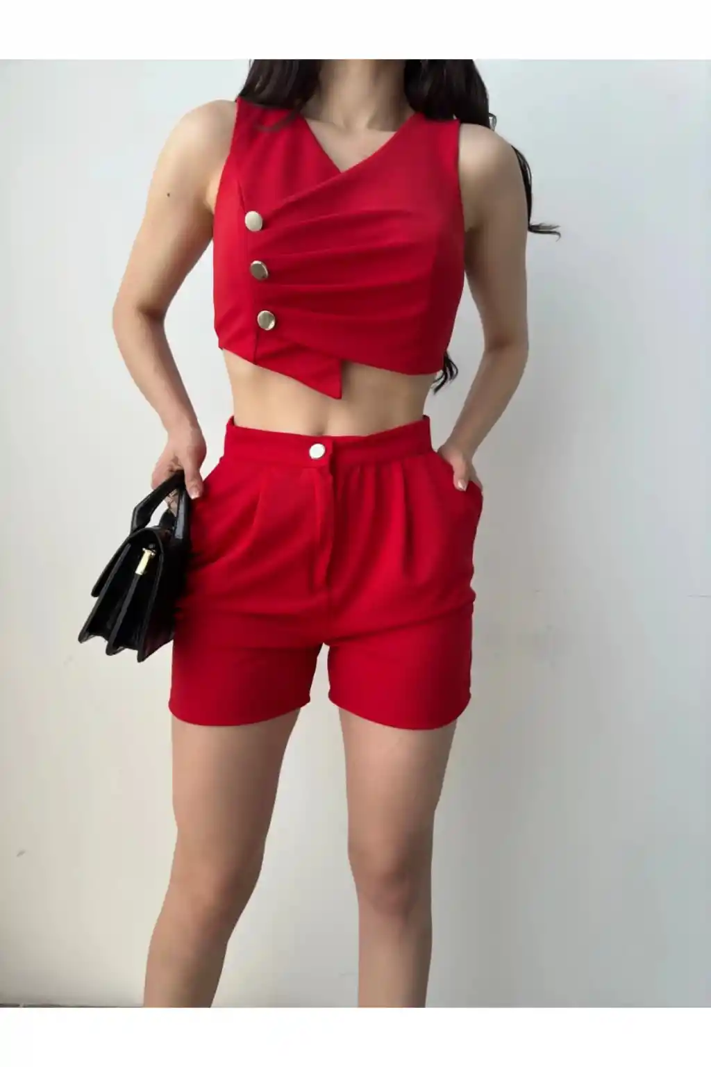 Kruvaze Yaka Düğme Detaylı Crop Yelek Ve Şort İkili Takım