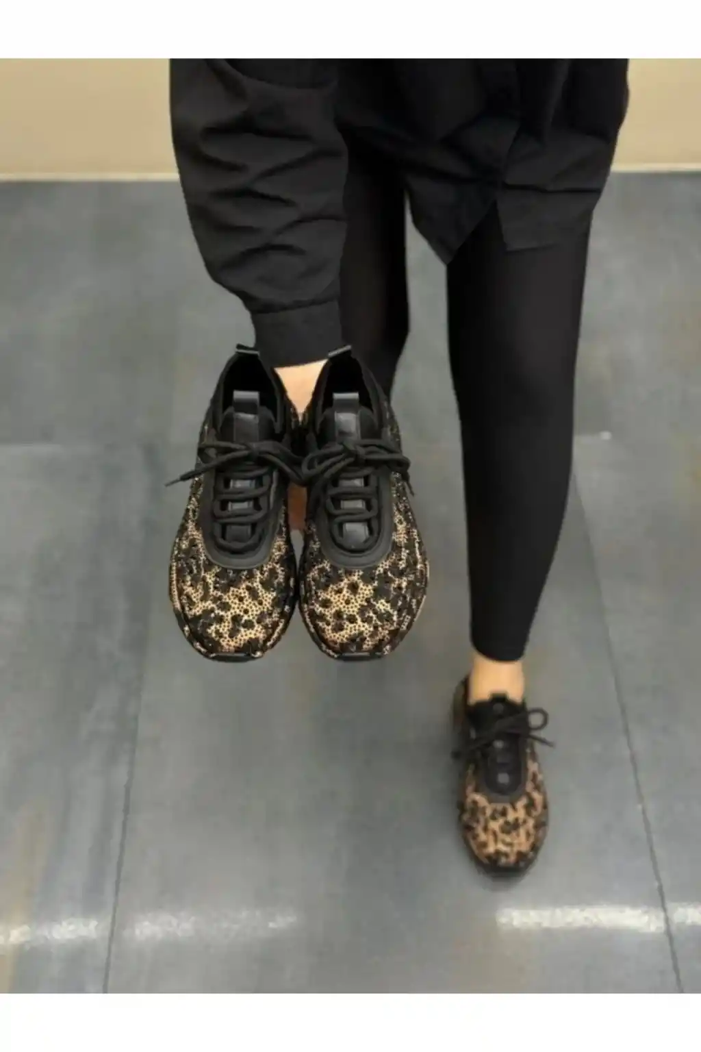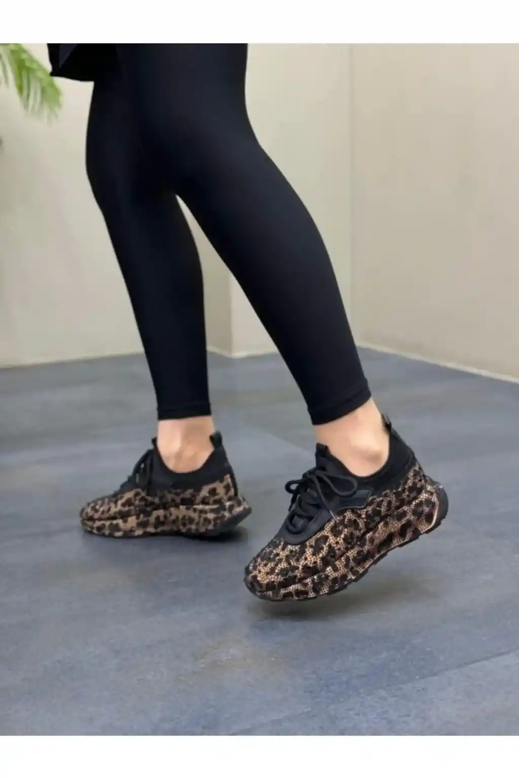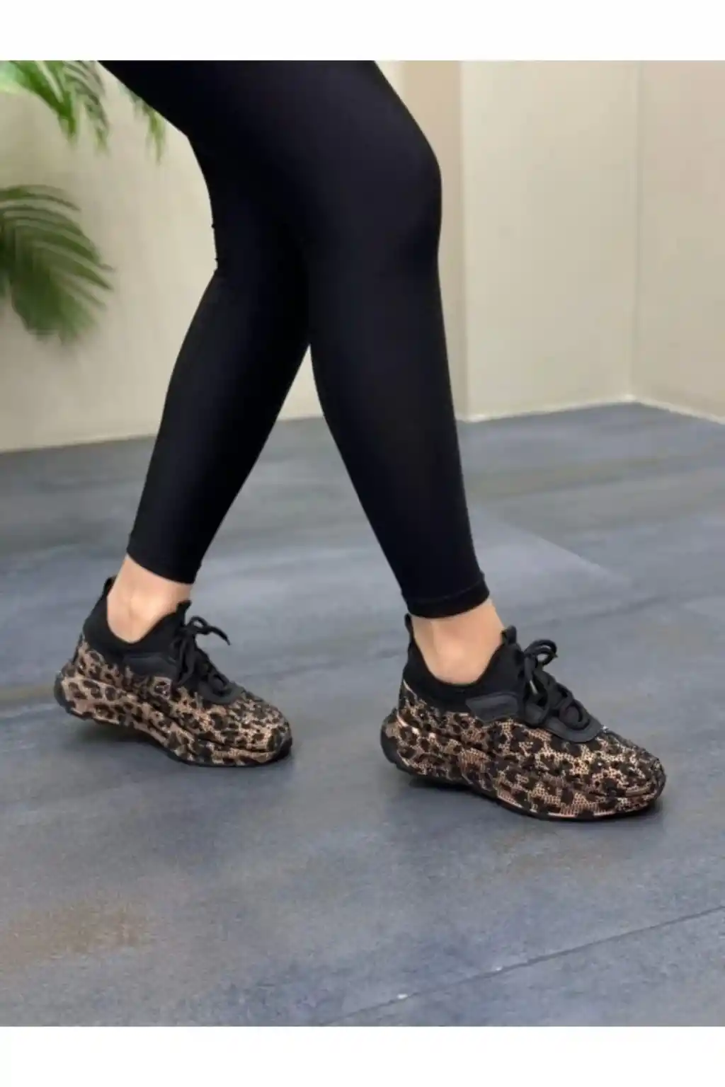 Özel leopar deseni ve taş detaylarıyla dikkat çeken bu ayakkabılar, günlük kullanım için idealdir.