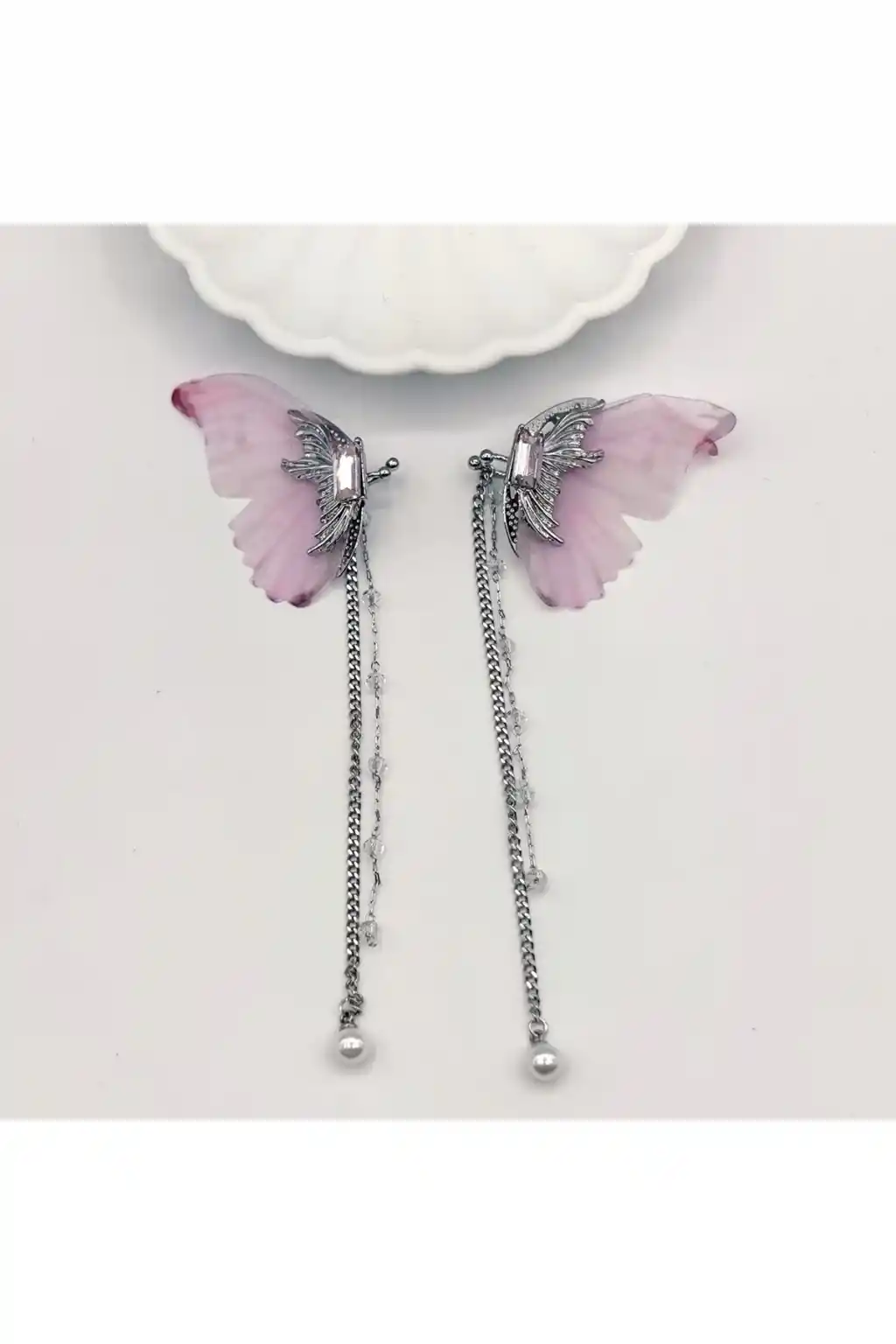 Model Tasarımlı Mor Kelebek Fiğürlü Zincir İnci Detaylı Kıkırdak Küpe