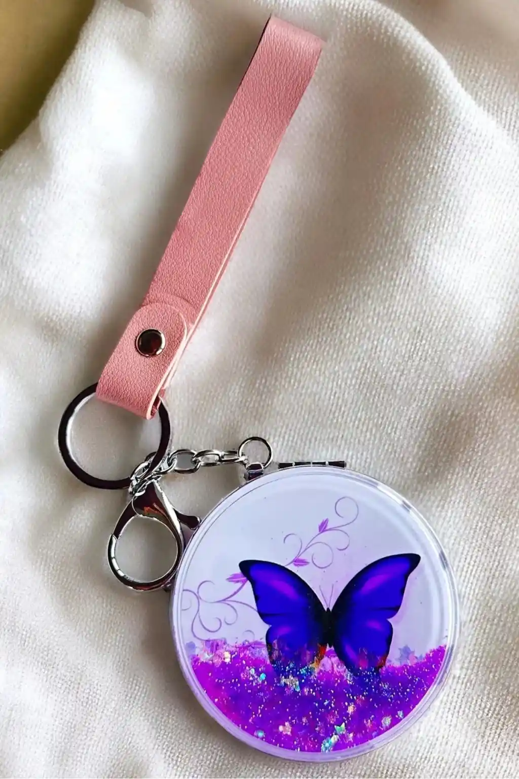Kelebek figürlü sim detaylı cep aynası anahtarlık, hem kendiniz için harika bir aksesuar seçeneği hem de sevdiklerinize hediye olarak düşünebileceğiniz şık bir tercihtir.