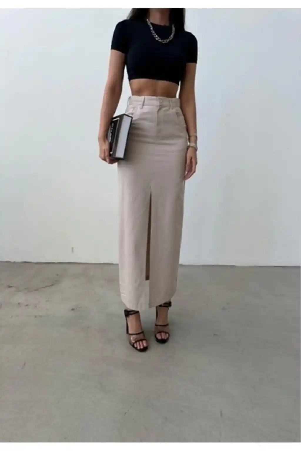 - Zarif tasarımıyla dikkat çeken önden yırtmaç detayı, hareket özgürlüğü sağlarken şıklığınızı ön plana çıkarır.; - Krem rengiyle her mevsim rahatlıkla tercih edilebilen bu etek, gardırobunuzdaki çok yönlü parçalardan biri haline gelir.; - Genç ve dinamik tarza sahip olan bu etek, genç kadınların enerjisini yansıtan modern bir görünüm sunar.; - Uzun boy kesimi ile bacaklarınızı olduğundan daha uzun göstererek feminen bir siluet oluşturur.; - Belirtilmemiş kumaş tipi sayesinde farklı dokulara uyum sağlayarak çeşitli kombinlerle kolayca eşleştirilebilir.