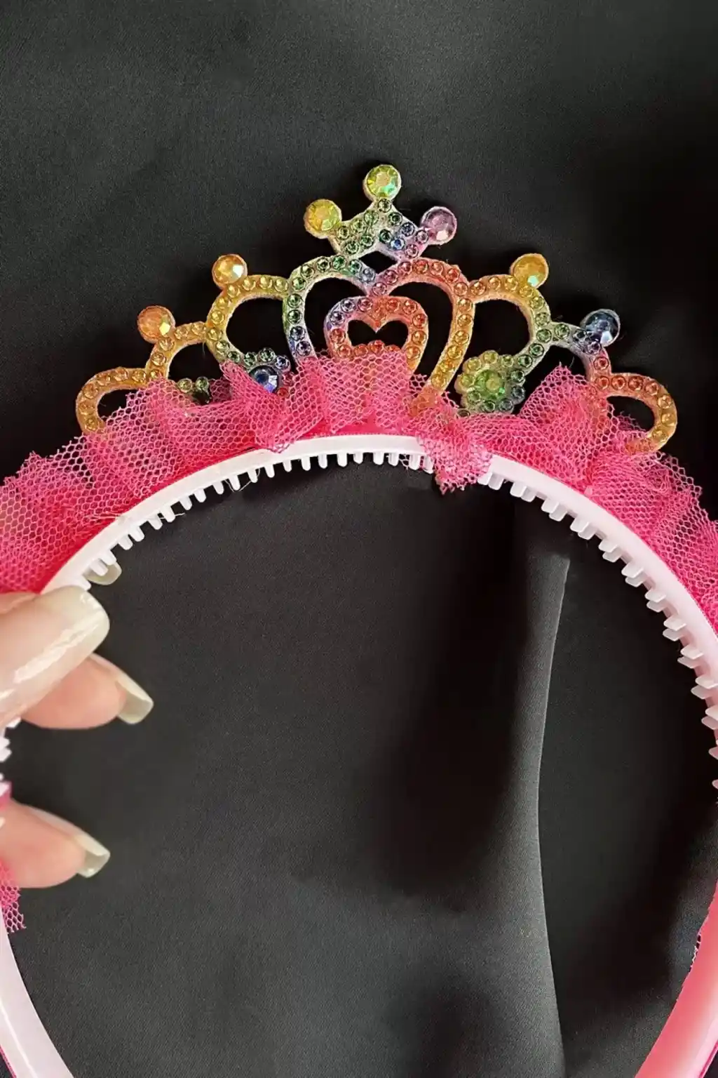 Çocukların hayal dünyasını renklendiren pembe renkli taç, özel günlerde ve kutlamalarda minik prenseslerin şıklığını tamamlar; Pembe tüllü tasarımı ile dikkat çeken bu taç, çocukların kendilerini özel hissetmelerini sağlar; Her yaş grubuna uygun olarak tasarlanmış olup, çocukların rahatça kullanabileceği şekilde üretilmiştir;