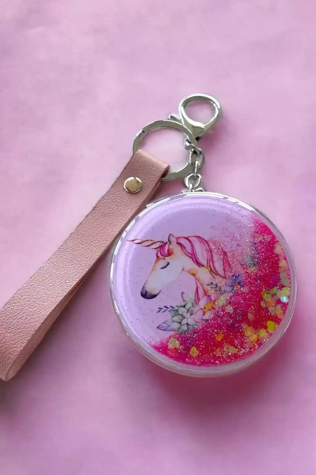 Pembe renkli anahtarlık, üzerindeki unicorn figürü ve simli detayları ile dikkat çekici bir görünüme sahiptir.