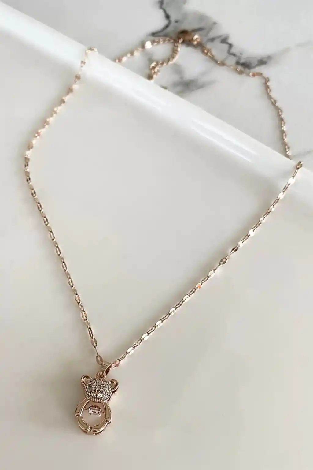 Rose Renk Ayıcık Figürlü Çelik Kolye, tarzınıza sevimlilik katacak harika bir aksesuardır.