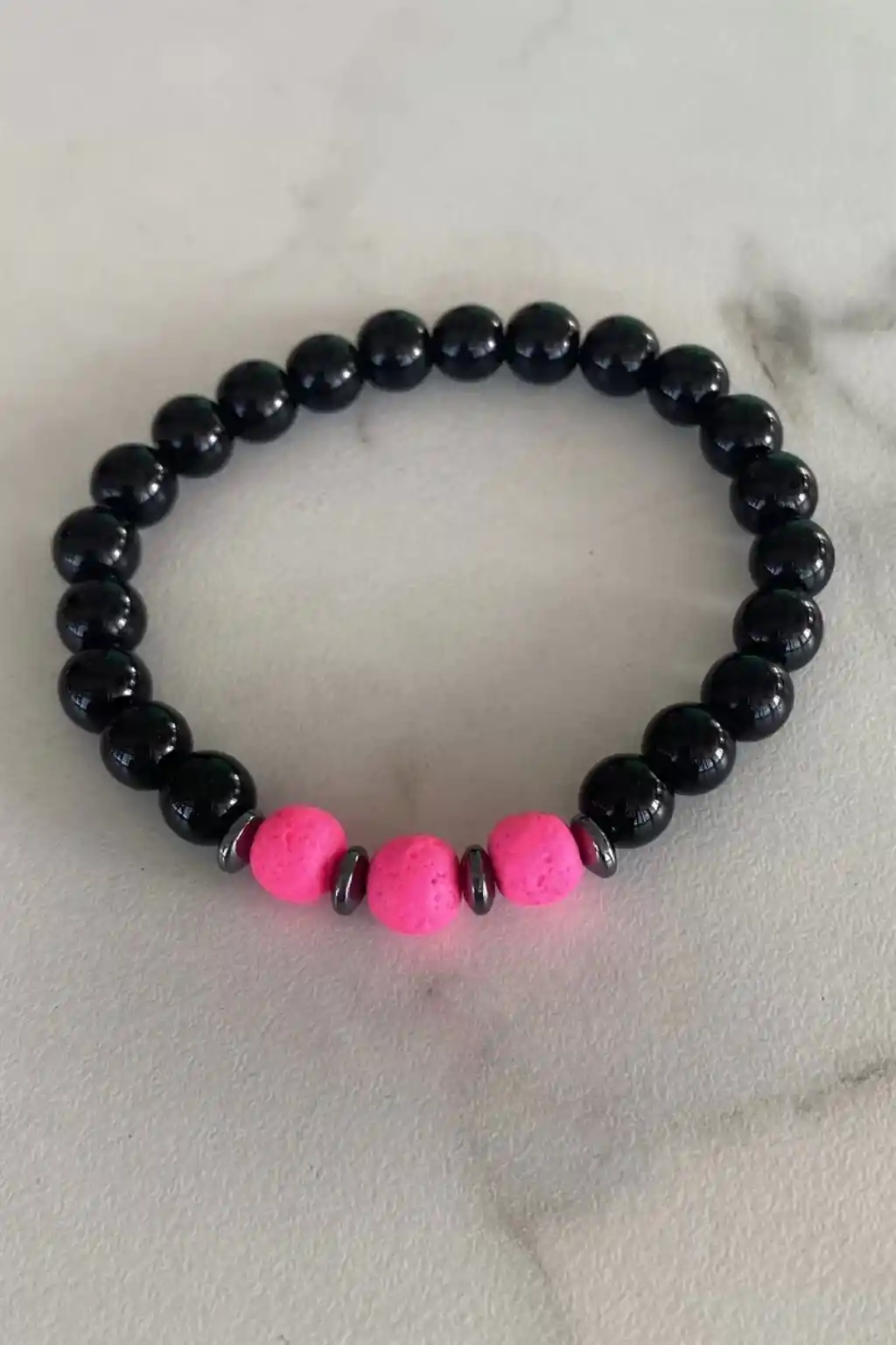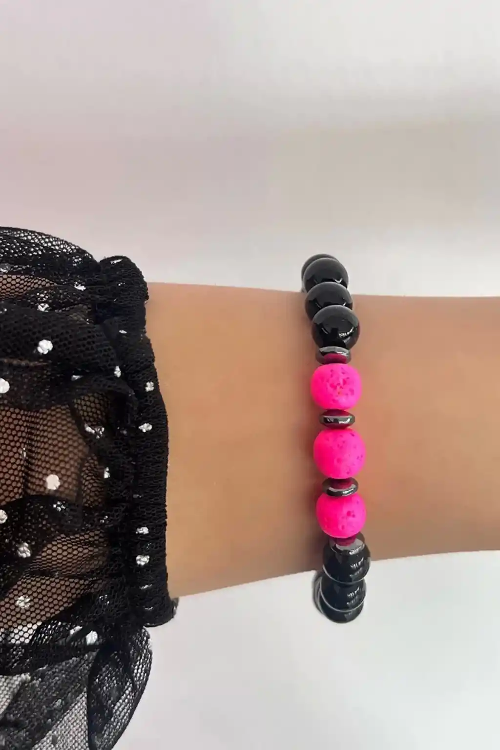 Bu şık siyah renk doğal taş boncuklu bileklik, her kombini tamamlayacak şık bir aksesuardır. Neon pembe detaylarıyla hareketlenen tasarımı, zarif ve göz alıcı bir görünüm sağlar.